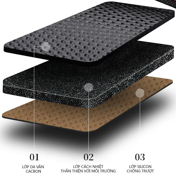 - Chất liệu da PU cao cấp bề mặt vân carbon 3D đẹp mắt, mặt bên dưới là các hạt silicon nhỏ được phun đều chống trơn trượt, không xe dịch thảm khi xe di chuyển.