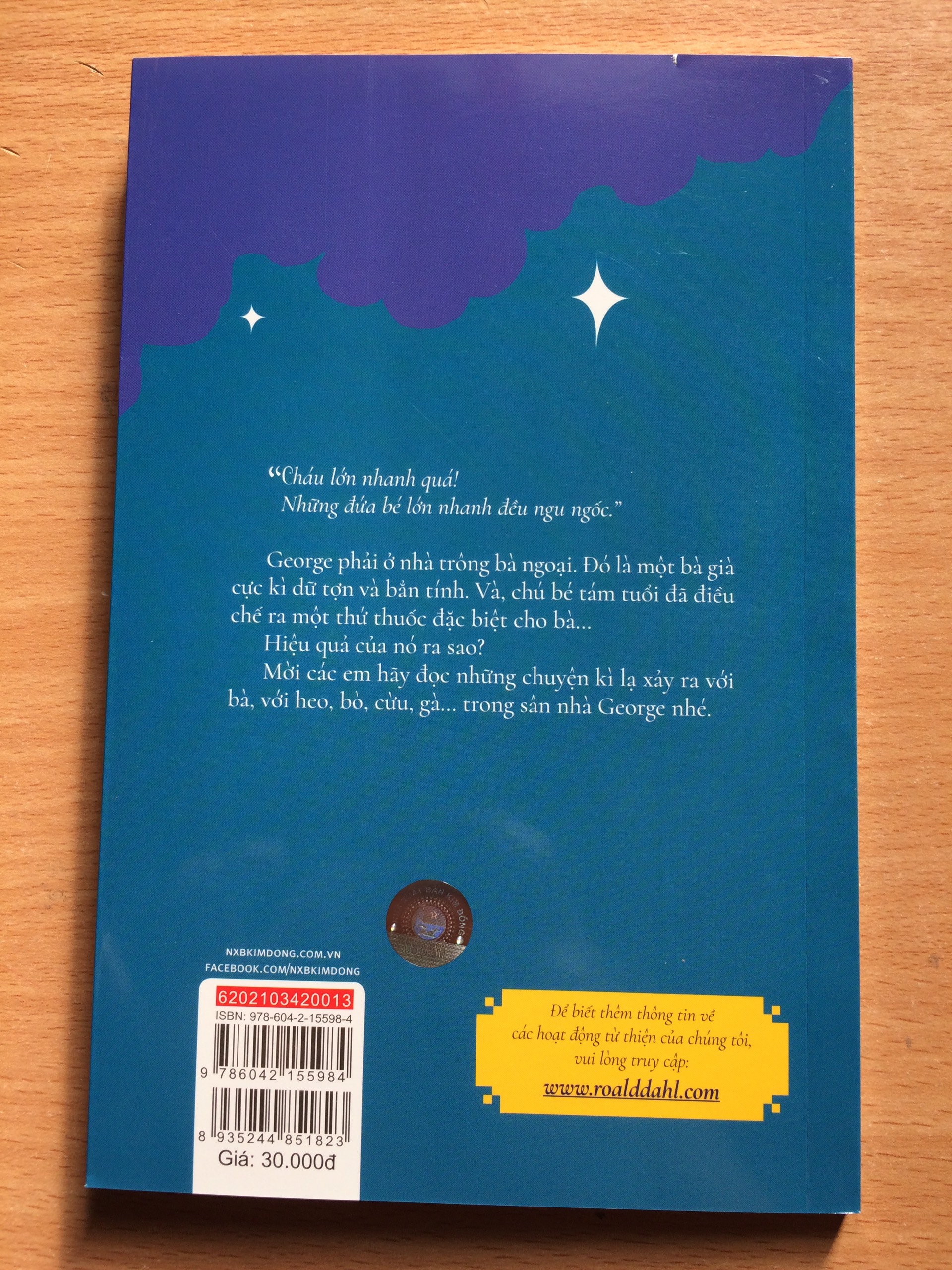GIỚI THIỆU TÁC PHẨM “Cháu lớn nhanh quá! Những đứa bé lớn nhanh đều ngu ngốc.” George phải ở nhà trông bà ngoại. Đó là một bà già cực kì dữ tợn và bẳn tính. Và, chú bé tám tuổi đã điều chế ra một thứ thuốc đặc biệt cho bà… Hiệu quả của nó ra sao? Mời các em hãy đọc những chuyện kì lạ xảy ra với bà, với heo, bò, cừu, gà… trong sân nhà George nhé. Roald Dahl (13.9.1916 – 23.11.1990) Roald Dahl từng là một điệp viên, một phi công ách, một sử gia về sôcôla và một nhà phát minh trong lĩnh vực y học. Ông cũng là tác giả của Charlie và nhà máy sôcôla, Cô bé Matilda, BFG – Người khổng lồ thân thiện… và rất nhiều những câu chuyện tuyệt vời khác. Roald Dahl được mệnh danh là Người kể chuyện số 1 Thế giới. Sách của Roald Dahl được xuất bản bằng hơn 55 ngôn ngữ trên toàn thế giới, với hàng chục triệu bản được phát hành. Nhiều cuốn sách của ông đứng đầu trong danh sách các tác phẩm văn học thiếu nhi hay nhất mọi thời đại. Mời các bạn tìm đọc bộ truyện của Roald Dahl: Chú rùa Alfie Bác Fox tuyệt vời Hươu cao cổ, chim bồ nông và tôi James và quả đào khổng lồ Ngón tay thần kì Phù thủy, phù thủy BFG – Người khổng lồ thân thiện Thần dược của George Vợ chồng lão Twit Cô bé Matilda Danny, nhà vô địch thế giới Charlie và nhà máy sôcôla Charlie và chiếc thang máy bằng kính Những ngày xưa yêu dấu Câu chuyện kì diệu về Henry Sugar và sáu chuyện khác