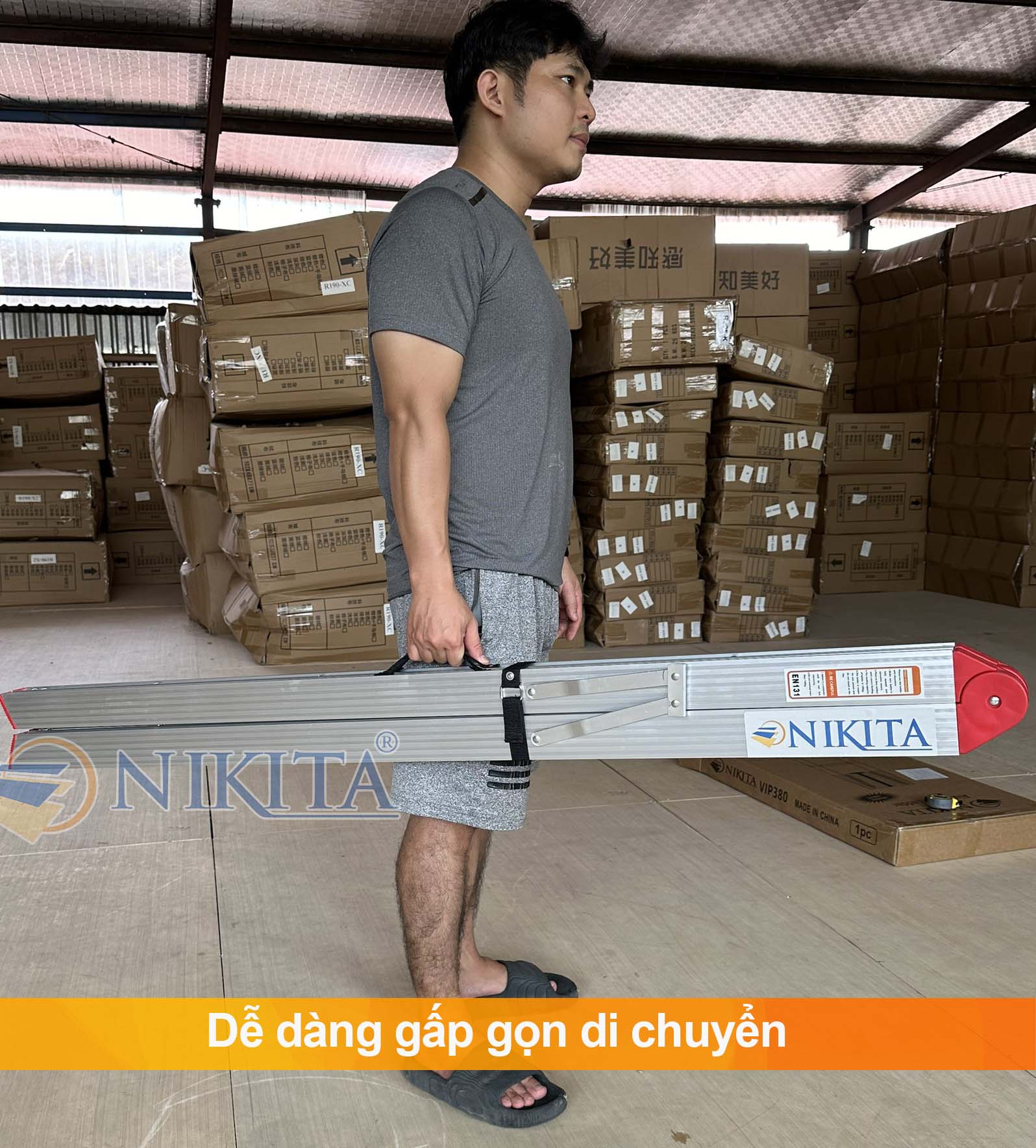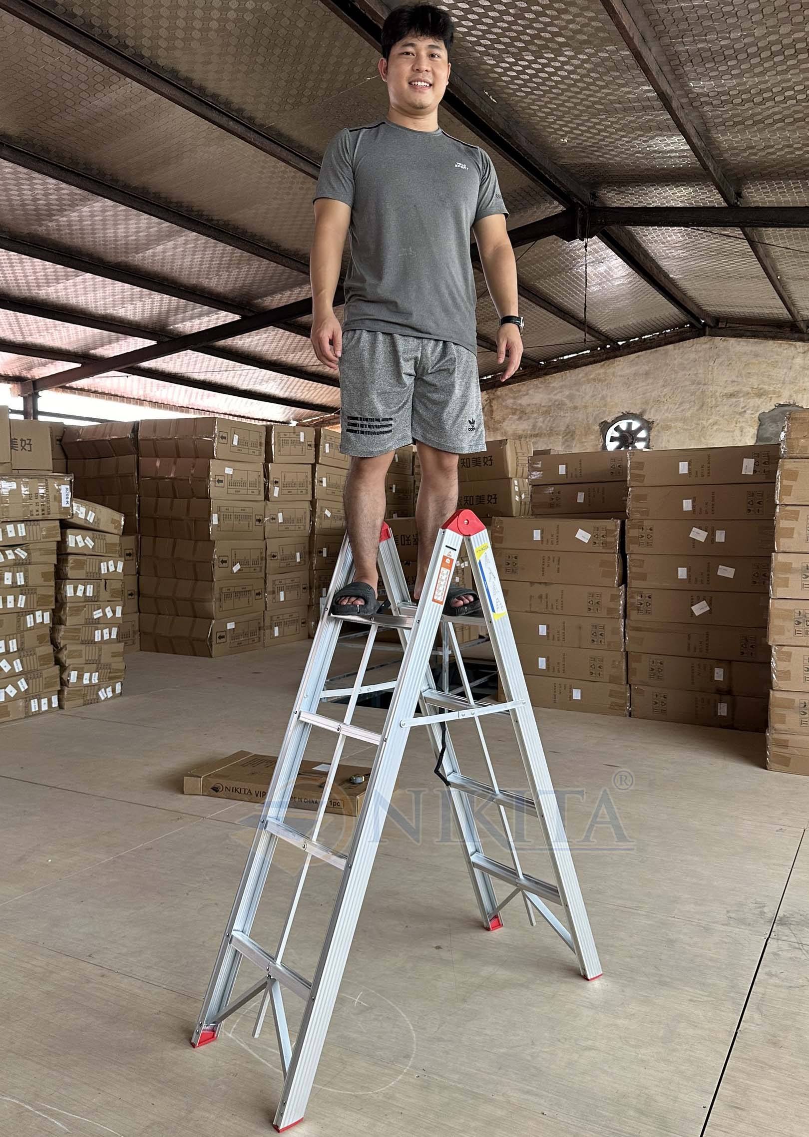 Thang nhôm Nikita NKT- NIKA20 Số lượng bậc: 6 bậc mỗi bên Chiều cao duỗi thẳng chữ I: 4 m Chiều cao chữ A : 1.9 m Trọng lượng: 7.2kg Công nghệ dập