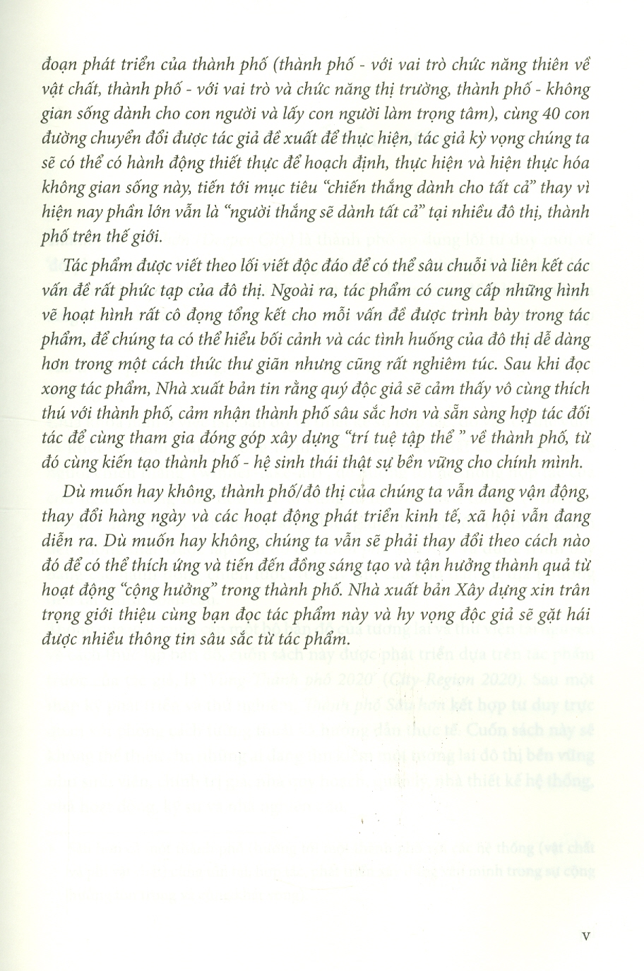 Dù muốn hay không, thành phố/đô thị của chúng ta vẫn đang vận động, thay đổi hàng ngày và các hoạt động phát triển kinh tế, xã hội vẫn đang diễn ra. Dù muốn hay không, chúng ta vẫn sẽ phải thay đổi theo cách nào đó để có thể thích ứng và tiến đến đồng sáng tạo và tận hưởng thành quả từ hoạt động “cộng hưởng” trong thành phố. Nhà xuất bản Xây dựng xin trân trọng giới thiệu cùng bạn đọc tác phẩm này và hy vọng độc giả sẽ gặt hái được nhiều thông tin sâu sắc từ tác phẩm.