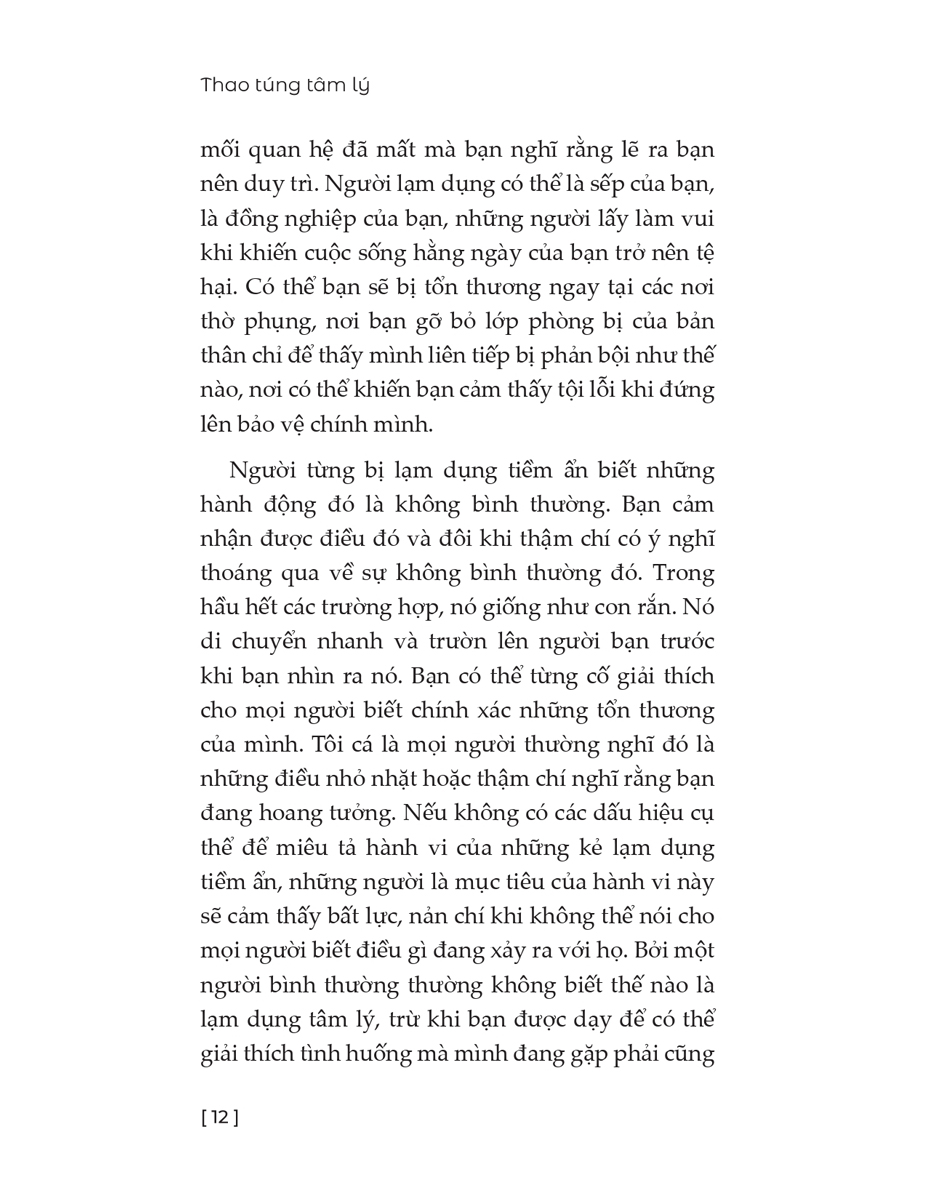 Shannon Thomas giới thiệu những kiến thức cơ bản về đặc điểm, các dạng của lạm dụng tâm lý nói chung, thao túng tâm lý nói riêng, và cung cấp cho người đọc hành trình chữa lành gồm 6 giai đoạn: