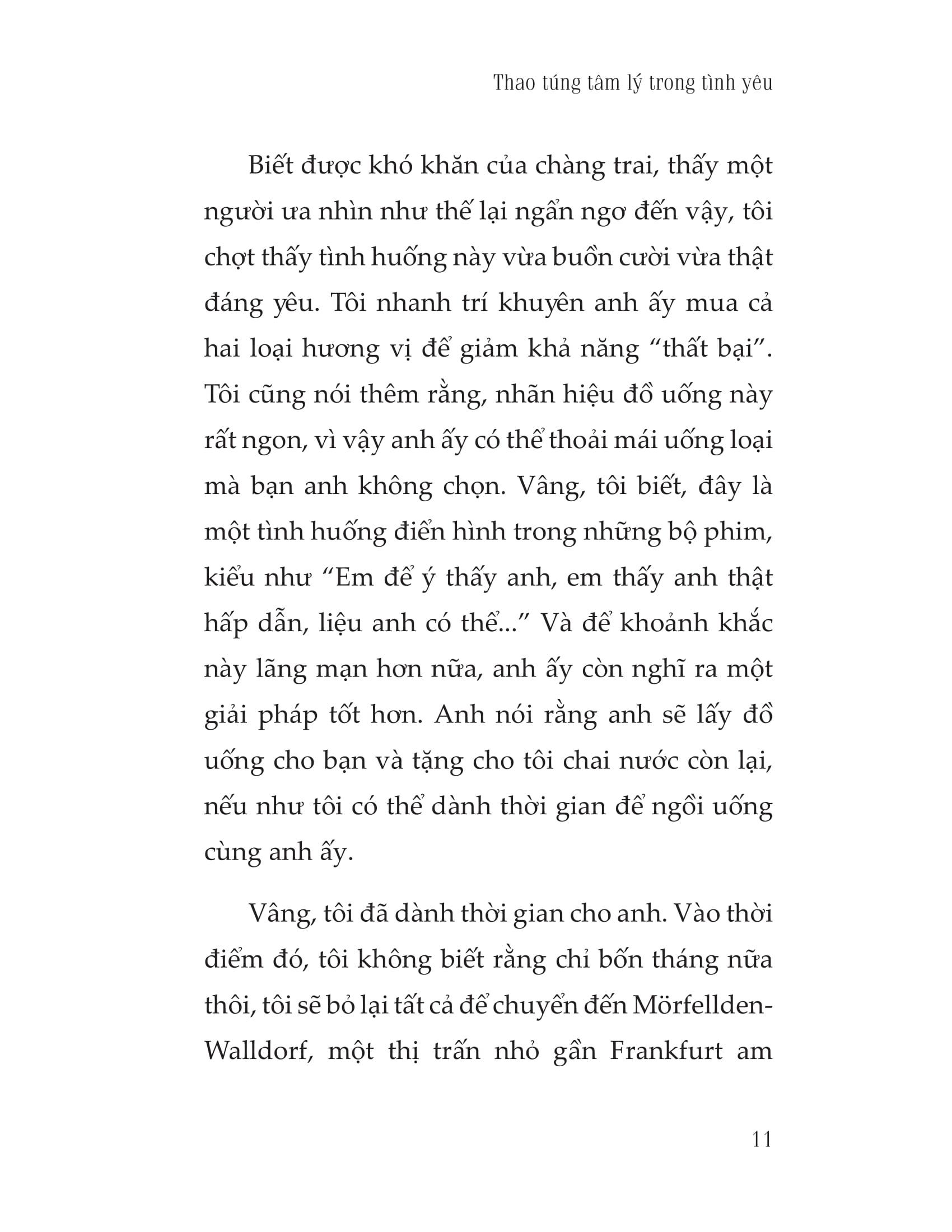 Cuốn sách “Thao túng tâm lý trong tình yêu” sẽ giúp bạn nhận ra các kiểu thao túng và lạm dụng tình cảm phổ biến nhất, thông qua câu chuyện đời thực của chính tác giả và những điều cô biết được khi gặp mặt những nạn nhân khác. Lời khuyên của các cá nhân đã trải qua tổn thương sẽ giúp bạn không còn lạc lối, để có thể tìm đến sự giải thoát và tự do. Khi có thể giữ mình tỉnh táo trước những hành vi thao túng, bạn không những thoát ra được tình trạng khổ sở, mà còn có thể từng bước phục hồi, để một lần nữa trở nên độc lập, tự tin, khỏe khoắn và nắm quyền làm chủ cuộc đời của mình.