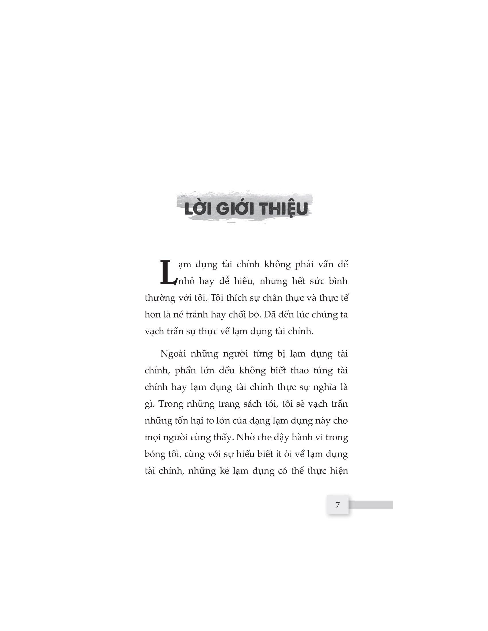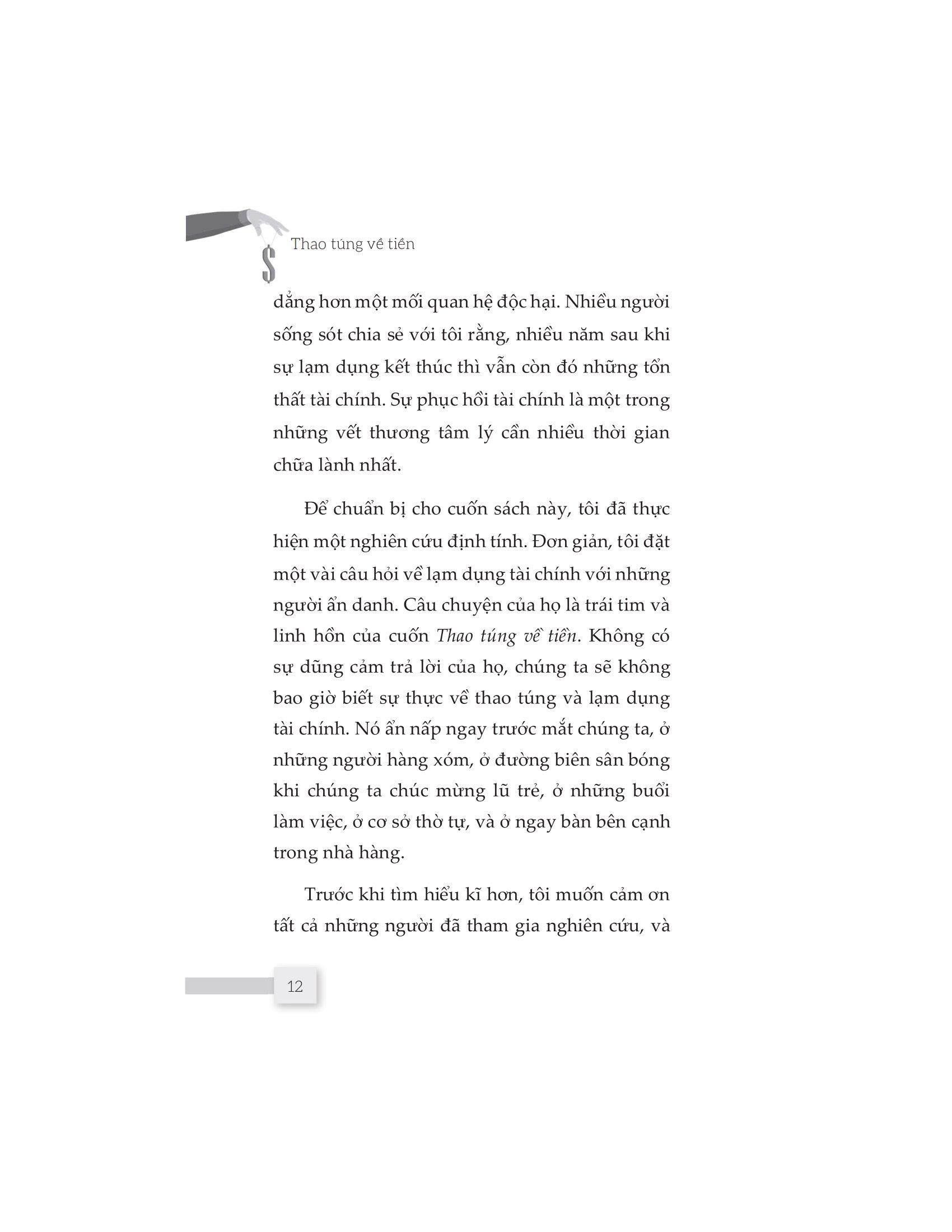 Cuốn sách “Thao túng về tiền” sẽ cho bạn cơ hội vén tấm màn che đậy và thấy được cuộc sống của những người bị tổn hại tài chính do những người thân thiết với họ gây ra. Nó cũng giúp bạn có được cái nhìn cụ thể và sâu sắc hơn về lạm dụng tài chính để nhận biết sớm, có hành động dứt khoát giúp bạn thoát khỏi hố sâu tâm lý và chữa lành những tổn thương tiềm ẩn.