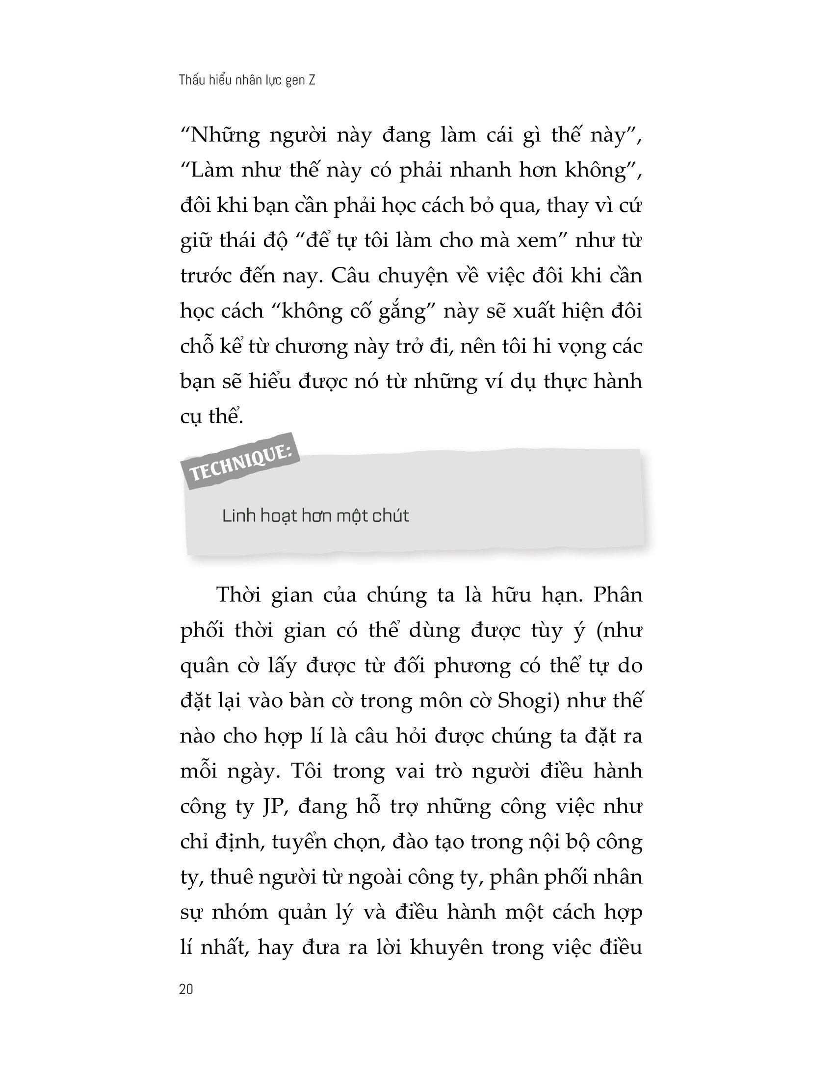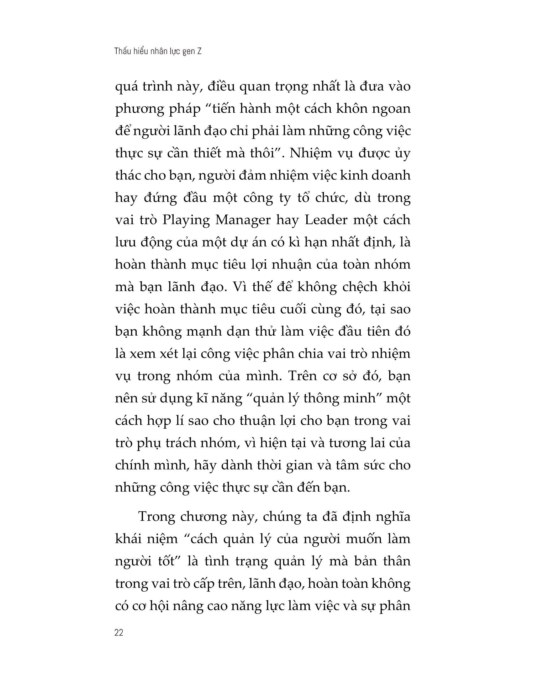 Cuốn sách « Thấu hiểu nhân lực gen Z » sẽ giúp bạn xác định mục tiêu của nhóm mà bạn quản lý là gì, từ đó làm rõ phương hướng, phương châm thực hiện để đạt được mục tiêu đó trong ngắn hạn, trung hạn, dài hạn, thực hiện chia sẻ quản lý tiến trình, và để tâm đến việc tạo động cơ động lực hướng đến hoàn thành mục tiêu. Trên cơ sở đó, bạn sử dụng kĩ năng quản lý thông minh một cách hợp lí sao cho thuận lợi cho bạn trong vai trò phụ trách nhóm.