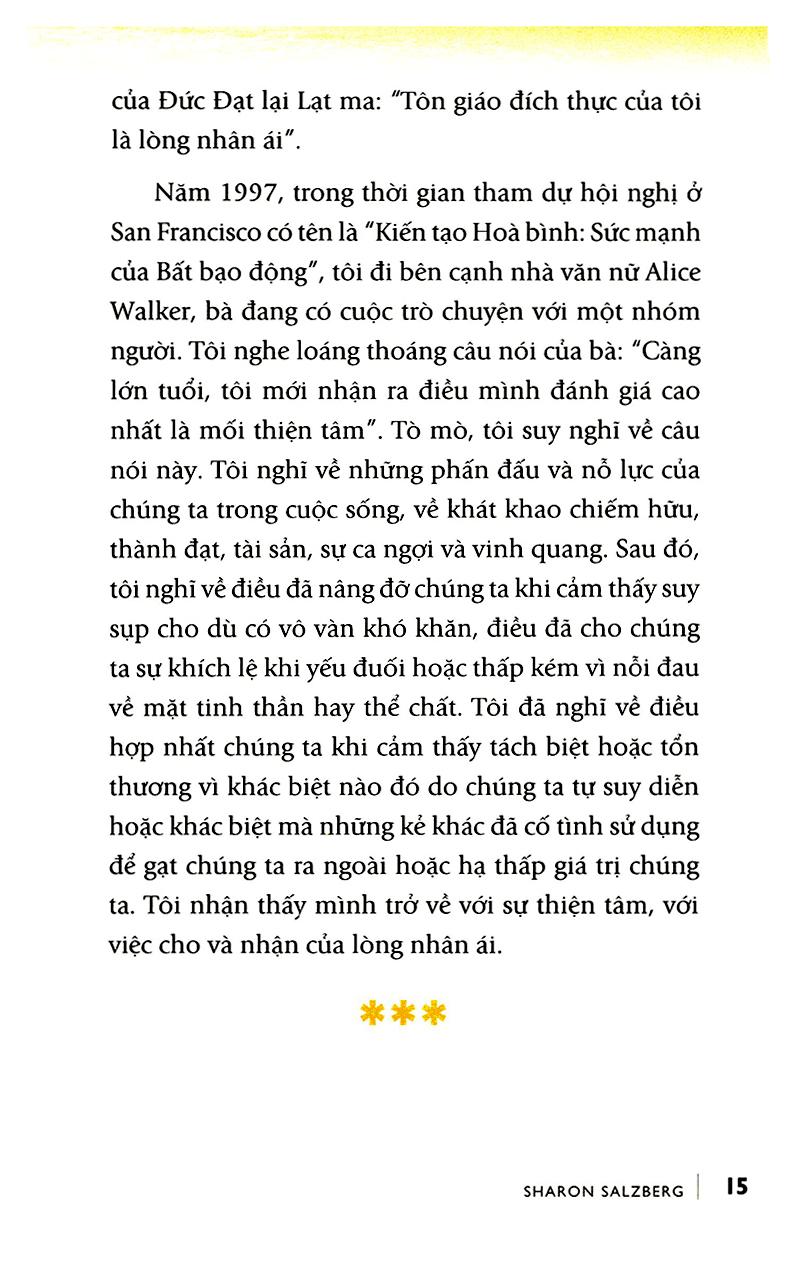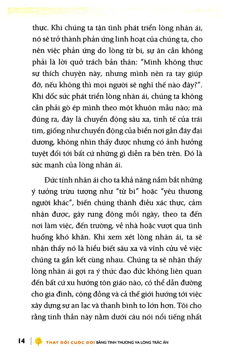 Điều gì sẽ xảy ra nếu lòng tốt và sự bao dung là kỹ năng tiềm ẩn mà bạn có thể phát triển? Với sách Thay đổi cuộc đời bằng tình thương và lòng trắc ẩn, Sharon Salzberg hướng dẫn độc giả trải nghiệm quá trình khám phá sức mạnh đích thực của lòng nhân ái và sử dụng nó làm hướng đi cho cuộc sống hàng ngày. Qua sách những câu chuyện mang tính giáo huấn, những hiểu biết sâu sắc từ những năm tháng làm chuyên gia hướng dẫn thiền định của Sharon và qua những bài tập thực hành, bạn sẽ học được cách nuôi dưỡng sự thanh thản, mở rộng trái tim đồng cảm và thể hiện sức mạnh của tình yêu thương tới mọi người.