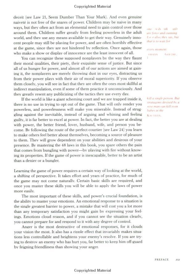Amoral, cunning, ruthless, and instructive, this piercing work distills three thousand years of the history of power in to forty-eight well explicated laws. As attention-grabbing in its design as it is in its content, this bold volume outlines the laws of power in their unvarnished essence, synthesizing the philosophies of Machiavelli, Sun-tzu, Carl von Clausewitz, and other great thinkers.