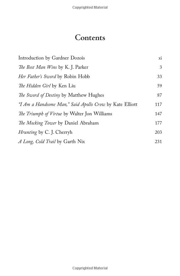 Now, in The Book of Swords, acclaimed editor and bestselling author Gardner Dozois presents an anthology of sixteen original epic stories by a stellar cast of modern masters, including George R.R. Martin, Robin Hobb, Garth Nix, Ken Liu, Daniel Abraham, Scott Lynch, Cecelia Holland, Ellen Kushner, and more on journeys into the outer realms of dark enchantment and intrepid adventure, featuring a stunning assortment of fearless swordsmen and warrior women who face down danger and death at every turn with courage, cunning, and cold steel.