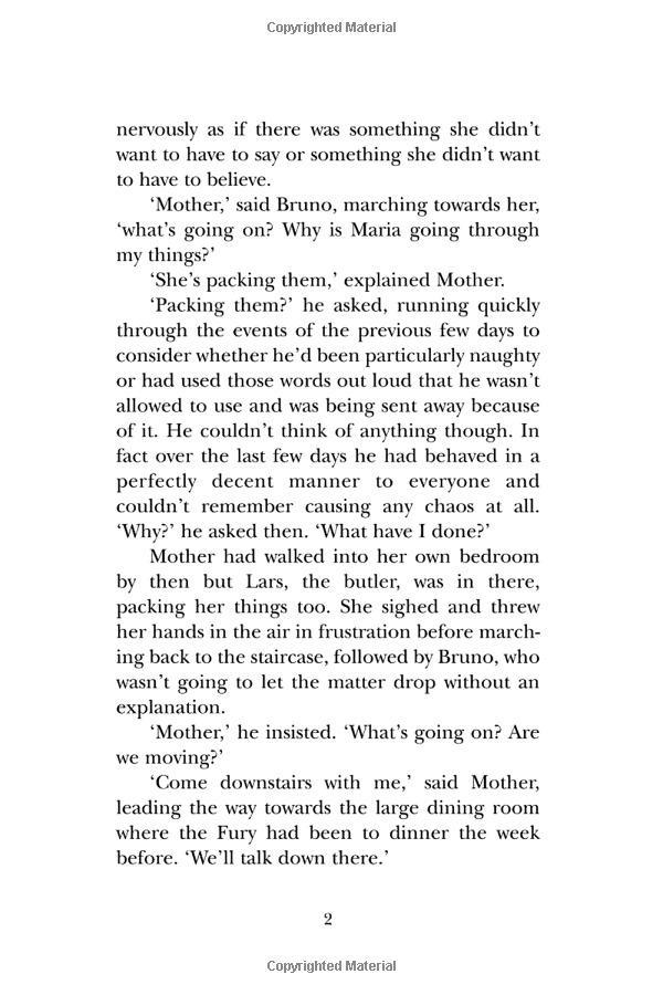 When Bruno returns home from school one day, he discovers that his belongings are being packed in crates. His father has received a promotion and the family must move from their home to a new house far far away, where there is no one to play with and nothing to do. A tall fence running alongside stretches as far as the eye can see and cuts him off from the strange people he can see in the distance.