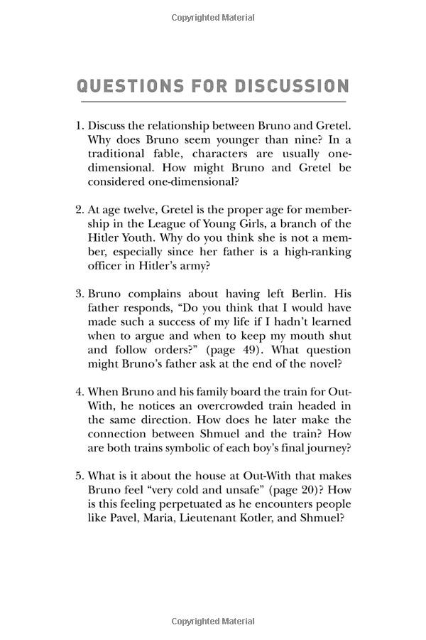 But Bruno longs to be an explorer and decides that there must be more to this desolate new place than meets the eye. While exploring his new environment, he meets another boy whose life and circumstances are very different to his own, and their meeting results in a friendship that has devastating consequences.