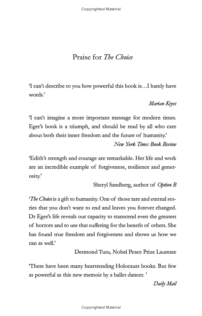 THE AWARD-WINNING INTERNATIONAL BESTSELLER by Edith Eger, as seen on BBC Breakfast Even in hell, hope can flower 'One of those rare and eternal stories you don't want to end and that leave you forever changed' - Desmond Tutu 'A masterpiece of holocaust literature. Her memoir, like her life, is extraordinary, harrowing and inspiring in equal measure' – The Times Literary Supplement ‘I can’t imagine a more important message for modern times. Eger’s book is a triumph' - The New York Times 'Little dancer', Mengele says, ‘dance for me’ In 1944, sixteen-year-old ballerina Edith Eger was sent to Auschwitz. Separated from her parents on arrival, she endures unimaginable experiences, including being made to dance for the infamous Josef Mengele. When the camp is finally liberated, she is pulled from a pile of bodies, barely alive. The horrors of the Holocaust didn't break Edith. In fact, they helped her learn to live again with a life-affirming strength and a truly remarkable resilience. The Choice is her unforgettable story. It shows that hope can flower in the most unlikely places .