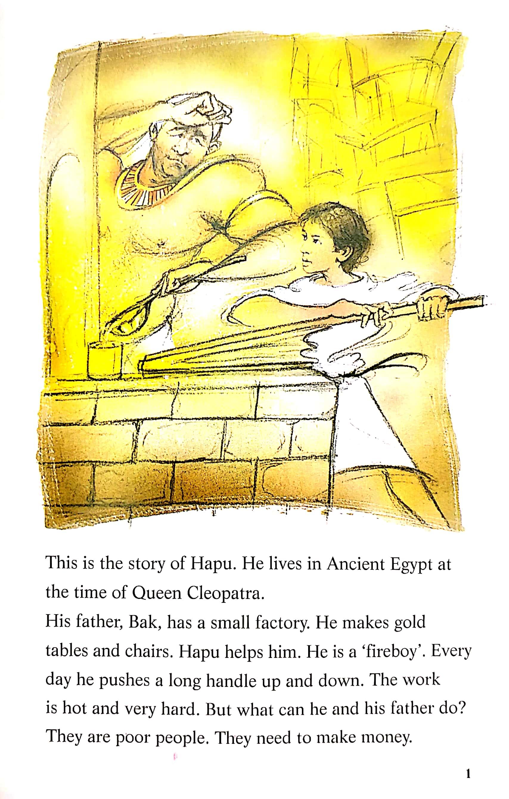 Original / British English Hapu lives in Ancient Egypt. Hapu's father is ill, but they haven't got any money for a doctor. Hapu makes a beautiful necklace for Queen Cleopatra and takes it to her. But a guard says, 'Go home'. How can Hapu meet the Queen and get a doctor for his father?