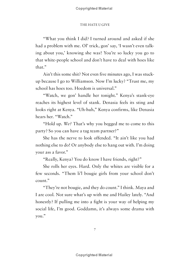 Soon afterward, his death is a national headline. Some are calling him a thug, maybe even a drug dealer and a gangbanger. Protesters are taking to the streets in Khalil’s name. Some cops and the local drug lord try to intimidate Starr and her family. What everyone wants to know is: what really went down that night? And the only person alive who can answer that is Starr.