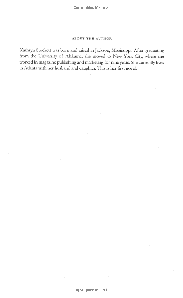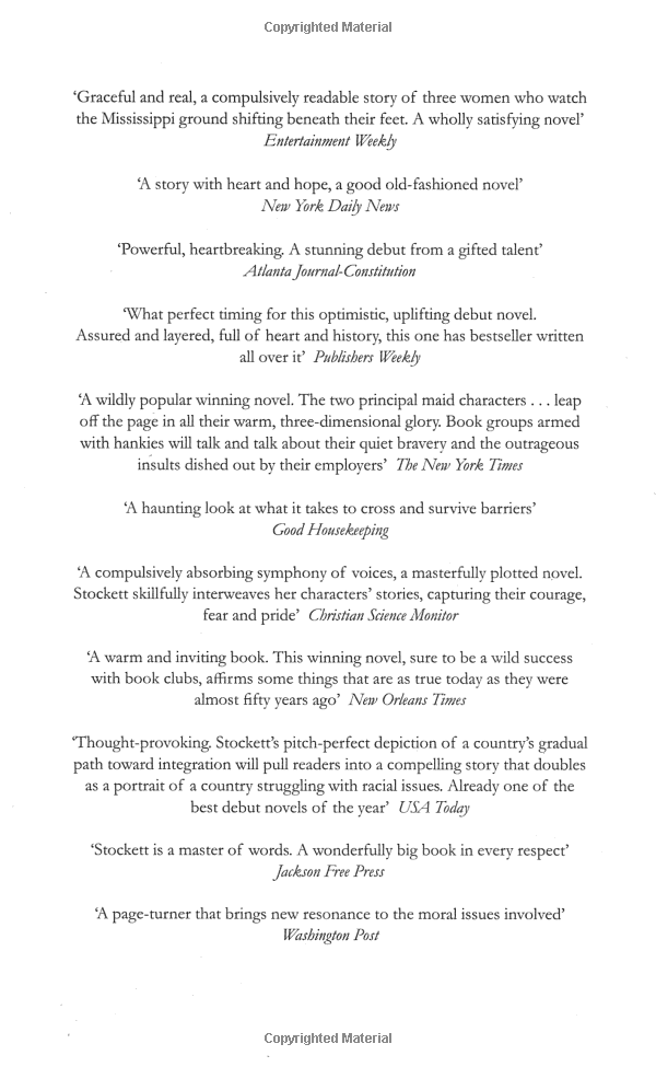 Twenty-two-year-old Skeeter has just returned home after graduating from Ole Miss. She may have a degree, but it is 1962, Mississippi, and her mother will not be happy till Skeeter has a ring on her finger. Skeeter would normally find solace with her beloved maid Constantine, the woman who raised her, but Constantine has disappeared and no one will tell Skeeter where she has gone.