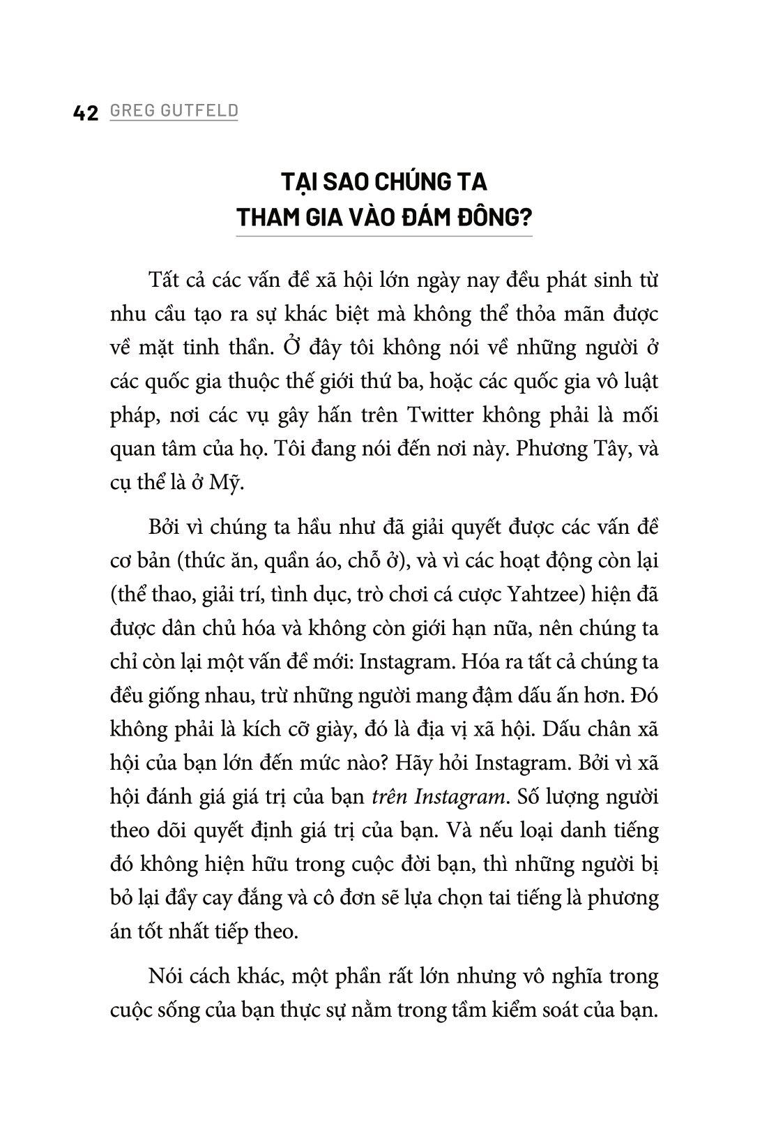The Plus - Self-Help Cho Người Ghét Self-Help Nhìn nhận cuộc sống qua lăng kính mới Trong cuộc sống, rất nhiều nhà tâm lý học đã phát hiện ra rất nhiều tư duy tác động đến con người cần phải suy ngẫm. Trong đó tư duy nhị nguyên cũng đang được nhiều người chú ý với nhiều lý luận khác nhau. Khi mọi người nghĩ về những thứ xung quanh, nghĩ về con người hay bản thân, mọi người thường sẽ tự nhiên phân chia thành 2 đối tượng như: nam-nữ, tốt-xấu, tự nhiên-văn hoá, hay có thể là cơ thể-tâm hồn, cá nhân-tập thể, Mặc dù vậy, không phải tất cả mọi thứ đi theo cặp đều là hai mặt. Điều đó khiến cuộc sống hiện đại đang ngày càng trở nên ‘phân cực’ khiến mọi người dễ cảm thấy trống rỗng và thiếu kết nối hơn với cộng đồng. Trong sách Self help cho người ghét self help, tác giả Greg Gutfeld cho thấy tất cả mọi người có thể cải thiện cuộc sống của họ và hàn gắn cộng đồng của họ. Trong sách, tác giả hướng dẫn bạn những cách "thôi miên" bản thân để có những hành vi tốt hơn, giữ lại những điểm tích cực/tốt đẹp trong cuộc sống của bạn và loại bỏ những điểm tiêu cực/yếu đuối. Self help cho người ghét self help Quyển sách này không phải là về sức mạnh của lối suy nghĩ tích cực. Đây là về việc trở nên tích cực. Mọi sự lựa chọn đều như một trò lật đồng xu may rủi: là cộng hay trừ? Hãy tự răn m.ình vào mỗi sáng để chọn một con đường tích cực và tránh xa hoặc loại bỏ bất kỳ điều gì có thể được xem là điểm trừ (có thể nói là điều tiêu cực). Vậy nên đây không phải là “hành động tử tế ngẫu nhiên”, hay “đáp đền tiếp nối”, hay “suy nghĩ tích cực”. Tất cả những thứ đó đều là những sự cân bằng tạm thời, dễ chịu và hầu như không đòi hỏi sự kỷ luật. Giải pháp là vĩnh viễn và không thể thay đổi. Nó thực sự tẩy não, nếu nó hoạt động một cách chính xác. Và đúng vậy, nghe có vẻ hơi “ám ảnh”. Toàn bộ tiền đề cho giải pháp đối với tất cả các vấn đề được đề cập trong cuốn sách này chỉ tóm gọn trong một câu mà bạn nên tự hỏi m.ình mỗi sáng. Theo thời gian, câu hỏi đó sẽ là thứ mà bạn tự hỏi bản thân trước mỗi cuộc họp, mỗi cuộc điện thoại, mỗi buổi hẹn hò và mỗi bữa tối. Nhưng nó sẽ bắt đầu vào sáng mai khi bạn thức dậy và đối diện với chính m.ình trong chiếc gương trong phòng tắm. Đó là câu hỏi dành cho bản thân: “Tôi sẽ là một điểm cộng, hay một điểm trừ?”. Hỏi câu này ở tất cả mọi người hợp và hãy biến m.ình thành những điểm cộng nhé! Về tác giả Greg Gutfeld Greg Gutfeld là một nhà bình luận chính trị theo chủ nghĩa tự do, là người dẫn chương trình của nhiều chuyên mục trên đài Fox News như: Red Ey, The Five, The Greg Gutfeld Show, Gutfeld, Năm 2021, chương trình Gutfeld! Đã vượt qua The Late Show with Stephen Colbert để trở thành chương trình trò chuyện đêm khuya có nhiều người xem nhất Hoa Kỳ. Greg là một diễn giả của Fox New và trước đó từng xuất bản các quyển sách đưa ra những nhận định về chính trị-xã hội. Nhưng gần đây, ông cảm thấy cần đưa ra thêm các giải pháp bên cạnh việc nêu ra và phân tích cách hiện tượng, đó là lý do quyển sách này được ra đời. Câu hỏi xuyên suốt được đặt ra trong cuốn sách "Tôi sẽ là điểm cộng hay điểm trừ".