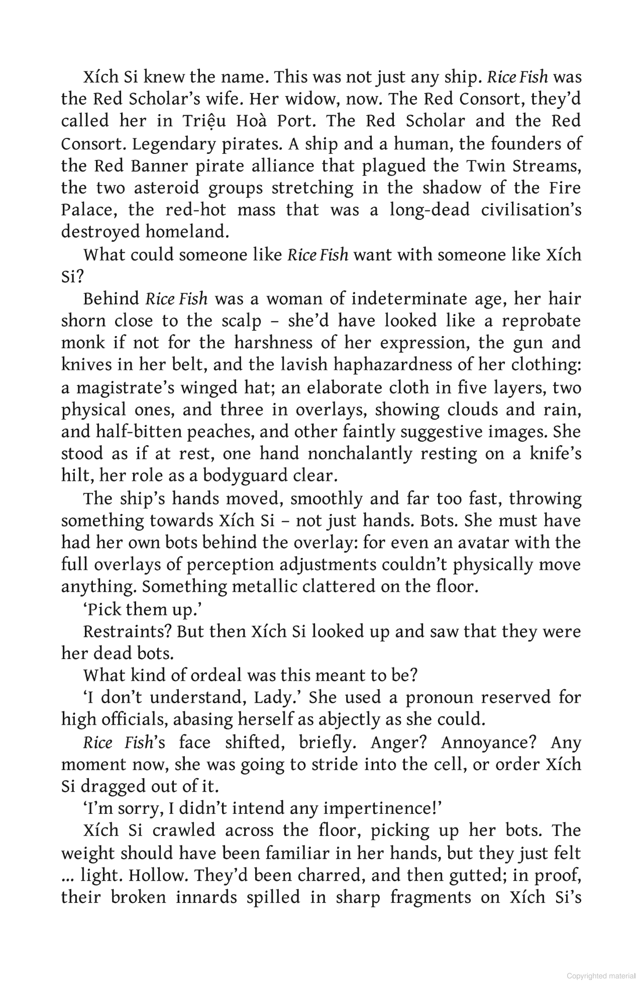 Rice Fish: sentient ship, leader of the infamous Red Banner pirate fleet, wife of the Red Scholar. Or at least, she was the latter before her wife died under suspicious circumstances. Now isolated and alone, Rice Fish wants Xích Si's help to find out who struck against them and why. Marrying Xích Si means Rice Fish can offer Xích Si protection, in exchange for Xích Si's technical fluency: a business arrangement with nothing more to it.