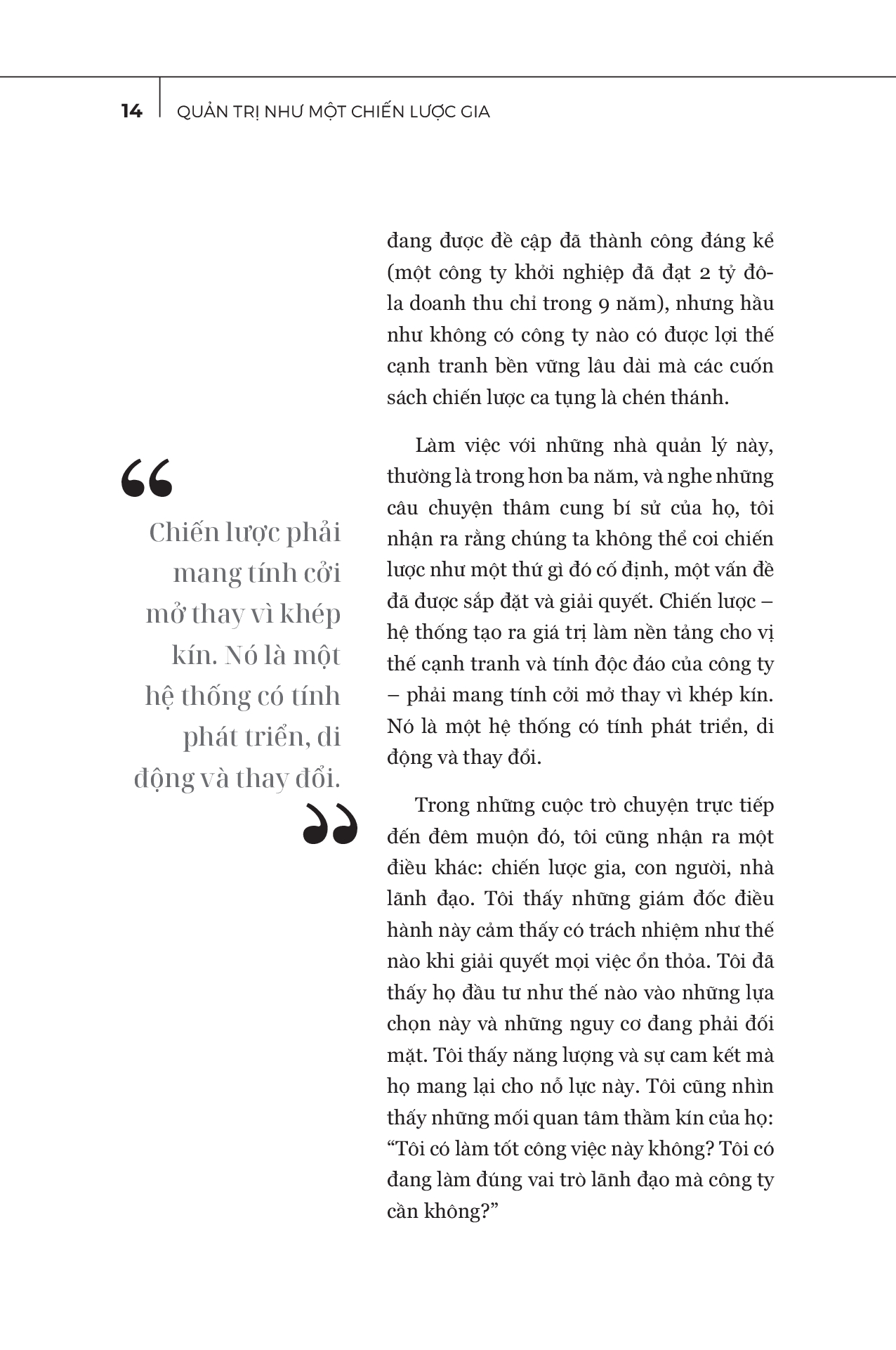Thông qua các nghiên cứu sâu sắc về sự thành công của các tập đoàn lớn, tác giả cho độc giả thấy được rằng chiến lược không chỉ là bản kế hoạch trên giấy, nó giống như thực thể sống và cần được chăm sóc, nuôi dưỡng để giúp doanh nghiệp vượt qua những giai đoạn thăng trầm trong kinh doanh.