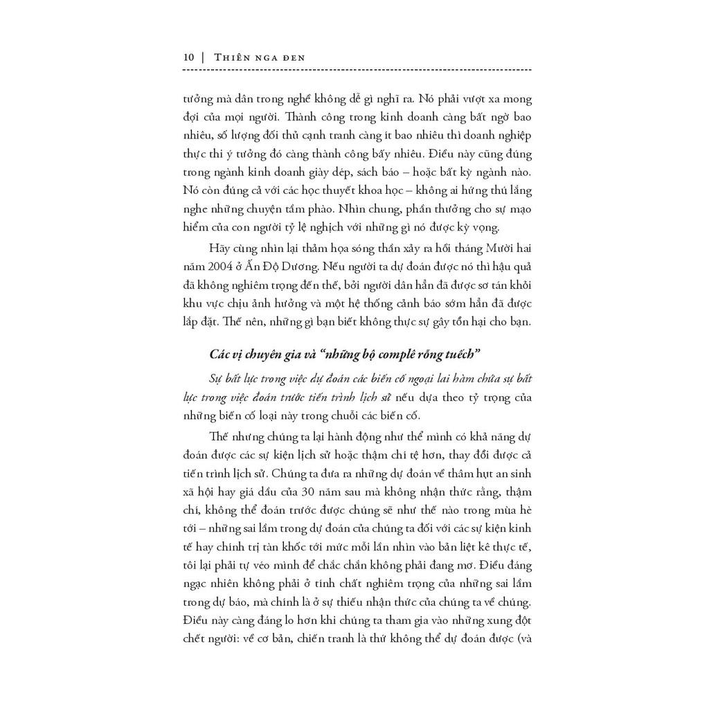 Chúng ta không biết rất nhiều thứ nhưng lại hành động như thể mình có khả năng dự đoán được mọi điều. Và trong cuốn sách này, tác giả Nassim Nicholas Taleb đã đi sâu vào khai thác những sai lầm của tư tưởng cố hữu ấy. Theo ông, “thiên nga đen” là một biến cố tưởng chừng như không thể xảy ra với ba đặc điểm chính: không thể dự đoán, có tác động nặng nề và sau khi nó xảy ra, người ta lại dựng lên một lời giải thích để khiến nó trở nên ít ngẫu nhiên hơn, dễ dự đoán hơn so với bản chất thật của nó. Thành công đáng kinh ngạc của Fb có thể được coi là một “thiên nga đen”, việc nước Anh rời khỏi Liên minh châu u cũng là một “thiên nga đen”. Thiên nga đen luôn ẩn hiện trong mọi mặt của cuộc sống với những tác động khó lường, theo cả hướng tiêu cực và tích cực.