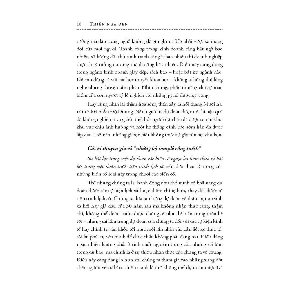 Trước khi khám phá ra thiên nga đen tồn tại trên đời (ở Úc), người ta vẫn tin rằng tất cả chim thiên nga trên đời đều có màu trắng. Phát hiện bất ngờ này đã thay đổi toàn bộ thế giới quan của nhân loại (về thiên nga). Chúng ta không biết rất nhiều thứ nhưng lại hành động như thể mình có khả năng dự đoán được mọi điều. Và trong cuốn sách này, tác giả Nassim Nicholas Taleb đã đi sâu vào khai thác những sai lầm của tư tưởng cố hữu ấy. Theo ông, “thiên nga đen” là một biến cố tưởng chừng như không thể xảy ra với ba đặc điểm chính: không thể dự đoán, có tác động nặng nề và sau khi nó xảy ra, người ta lại dựng lên một lời giải thích để khiến nó trở nên ít ngẫu nhiên hơn, dễ dự đoán hơn so với bản chất thật của nó. Thành công đáng kinh ngạc của Fb có thể được coi là một “thiên nga đen”, việc nước Anh rời khỏi Liên minh châu Âu cũng là một “thiên nga đen”. Thiên nga đen luôn ẩn hiện trong mọi mặt của cuộc sống với những tác động khó lường, theo cả hướng tiêu cực và tích cực. Tinh tế, táo bạo nhưng không kém phần thú vị, Thiên Nga Đen chắc chắn là cuốn sách không thể bỏ qua cho những ai đam mê hiểu biết. Và cuốn sách này, bản thân nó cũng chính là một thiên nga đen…