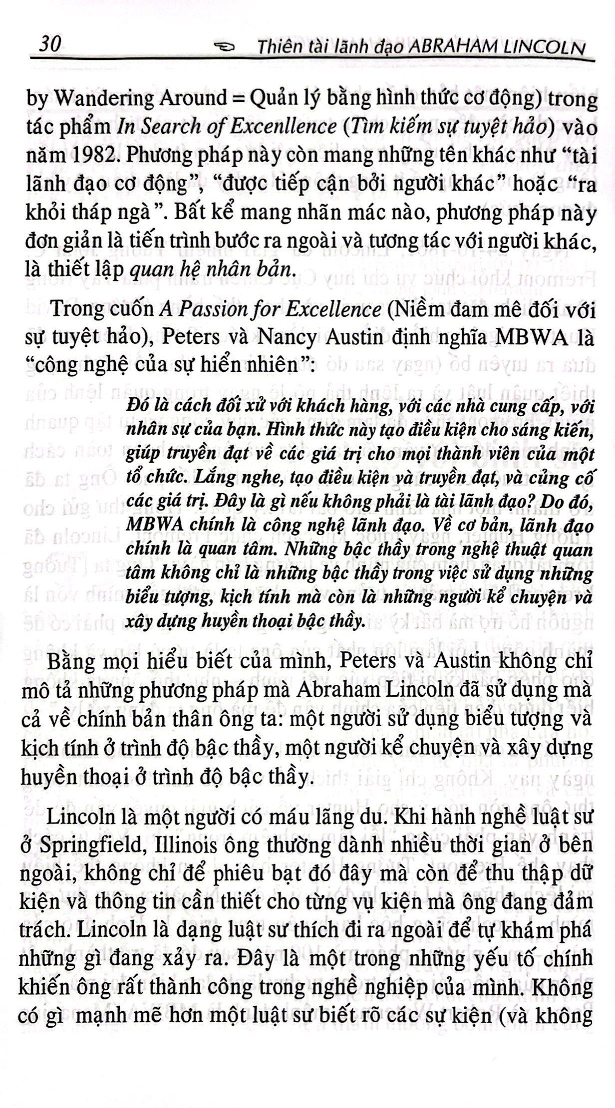 Tại sao các nhà lãnh đạo đương thời lại chuộng phong cách và triết lý lãnh đạo của Abraham Lincoln? Bởi vì, theo các tiêu chuẩn hiện đại, những thành tựu của Lincoln được xem như một phép lạ. Không thể nào không tin rằng Lincoln là nhà lãnh đạo vĩ đại nhất được biết đến của đất nước này và có thể là cả thế giới. Rõ ràng ông đã vượt hẳn những gương mẫu của thời hiện đại như Iacocca, Reagan hoặc Bush. Không có một sự so sánh nào xác đáng cả. Lincoln là một người thực sự biết cách lãnh đạo. Lincoln là một nhà lãnh đạo thực sự có gì đó mới mẻ để trao cho các nhà lãnh đạo chính trị và kinh doanh đương đại.