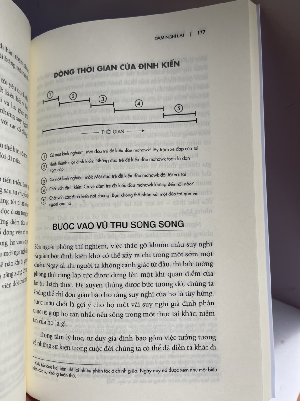 Bên cạnh đó, khái niệm vòng lặp cố chấp cũng được tác giả phân tích cặn kẽ để độc giả thấy được những yếu tố ngăn trở ta tái tư duy, đó là tính tự phụ, tư duy xác tín, thiên kiến xác nhận và niềm tin huyễn hoặc về bản thân. “Dám nghĩ lại” thôi thúc độc giả vứt bỏ những kiến thức đã lỗi thời, những quan điểm xưa cũ không còn đúng đắn để thôi mắc kẹt trong những vòng lặp cố chấp.