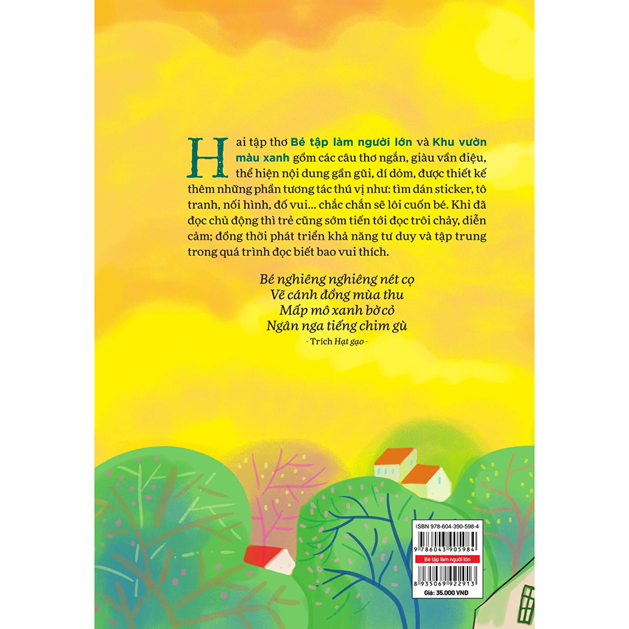 Những câu thơ ngắn, ngôn từ gần gũi, giọng thơ ngộ nghĩnh giúp trẻ dễ đọc, dễ nhớ. Bên cạnh đó, các bức minh họa sinh động với gam màu tươi tắn cũng tạo cơ hội cho trẻ làm quen với các mảng màu sắc, trí tưởng tượng của trẻ phát triển. Hoạt động đọc cần diễn ra với cảm xúc tò mò, hứng khỏi, nhờ đó các bé nhớ từ nhanh hơn, mở rộng vốn từ tốt hơn. Hai tập thơ “Khu vườn màu xanh” và “Bé tập làm người lớn” gồm các câu thơ ngắn, giàu vần điệu, thể hiện nội dung gần gũi, dí dỏm, lại được thiết kế những phần tương tác thú vị như: tìm dán sticker, tô tranh, nối hình, đố vui… chắc chắn sẽ lôi cuốn bé. Một khi đã đọc chủ động thì trẻ cũng sớm tiến tới đọc trôi chảy, diễn cảm; đồng thời phát triển khả năng tư duy và tập trung trong quá trình đọc biết bao vui thích.
