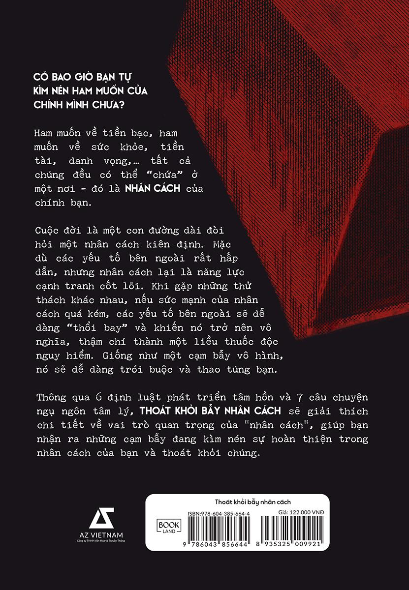 Thông qua 6 định luật phát triển tâm hồn và 7 câu chuyện ngụ ngôn tâm lý, THOÁT KHỎI BẪY NHÂN CÁCH sẽ giải thích chi tiết về vai trò quan trọng của “nhân cách”, giúp bạn nhận ra những cạm bẫy đang kìm nén sự hoàn thiện trong nhân cách của bạn và thoát khỏi chúng.