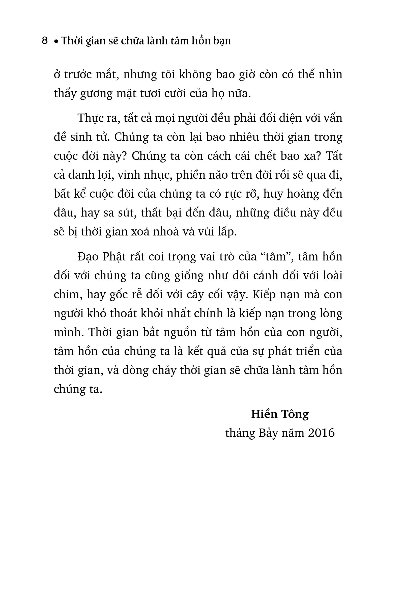 Với bút pháp sâu lắng và triết lý Phật giáo tinh tế, Hiền Tông dẫn dắt độc giả đi qua những góc nhìn mới về khổ đau, nhân quả và sự vô thường. Cuốn sách nhấn mạnh rằng mọi nỗi buồn rồi cũng sẽ qua đi, mọi mất mát rồi cũng sẽ nguôi ngoai, và thời gian chính là phương thuốc hữu hiệu nhất để chữa lành vết thương trong tâm trí con người.