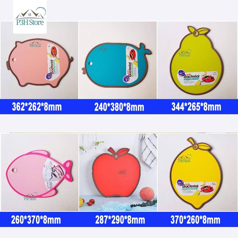 Thớt gồm nhiều mẫu : cá heo , trái lê , trái chanh , cá hồng , táo đỏ.