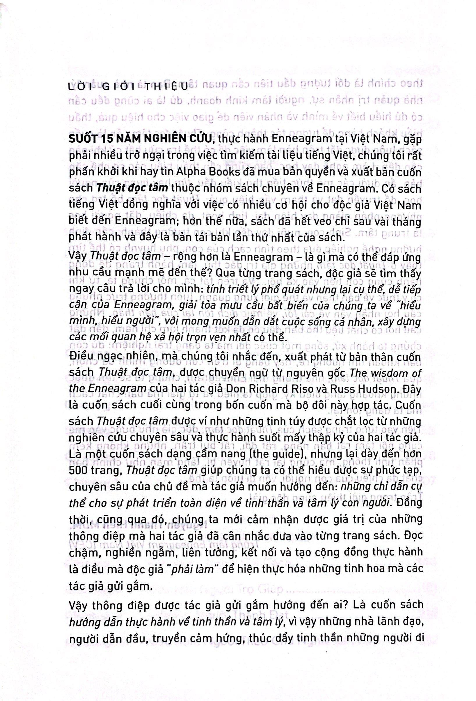 Không chỉ đưa ra hướng dẫn để nhận biết các kiểu tính cách, Thuật đọc tâm còn cung cấp các bảng hỏi có độ chính xác cao để xác định từng kiểu người, hàng chục bài tập cá nhân và chiến lược cụ thể nhằm cải thiện các mối quan hệ, thói quen xấu, gia tăng sự tự do của nội tâm… Cuốn sách không chỉ dành cho những chuyên gia nghiên cứu chuyên sâu và còn dành cho cả những người mới bắt đầu, dễ dàng áp dụng trong cuộc sống thường ngày.