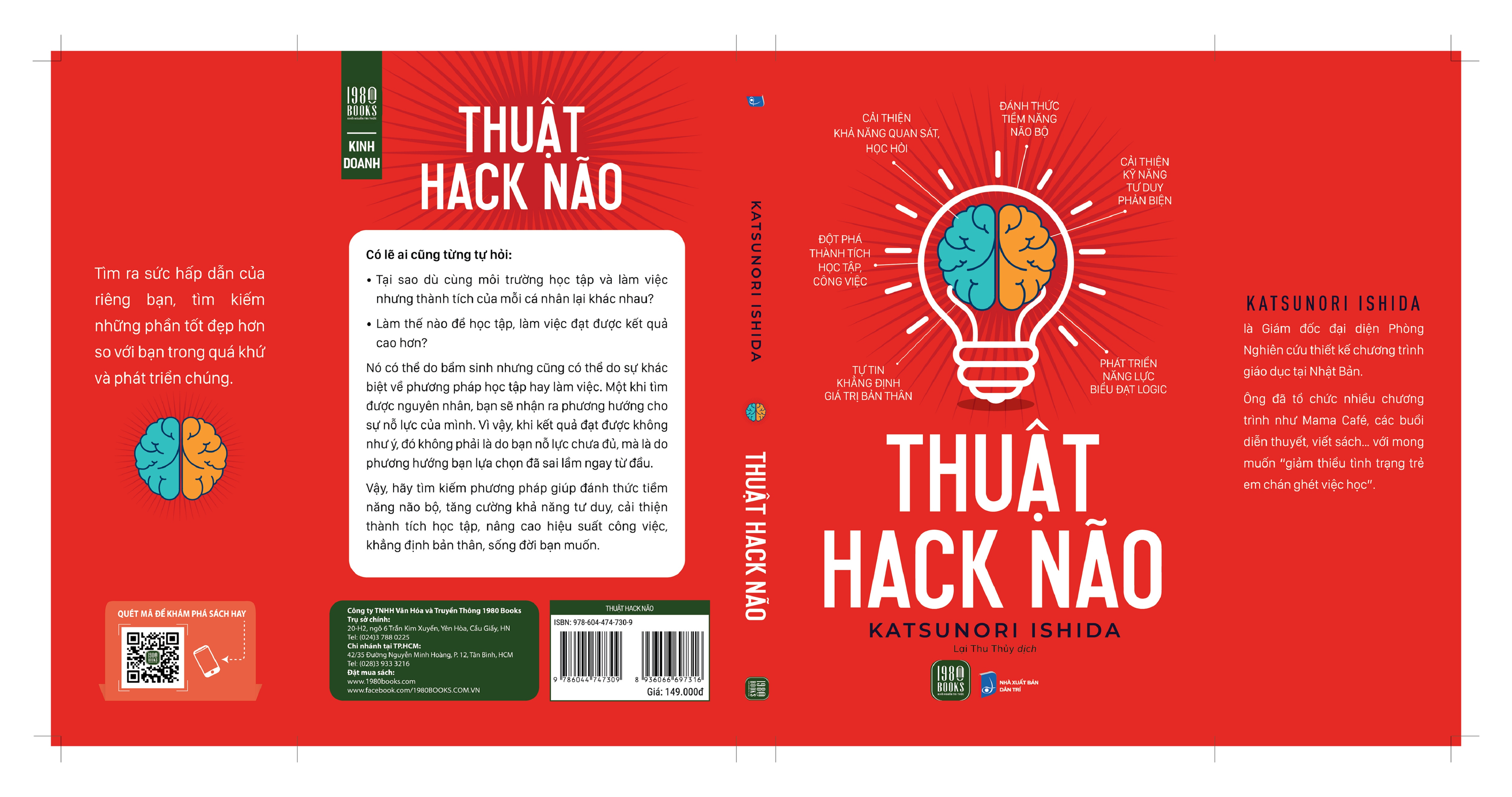 - Làm thế nào để học tập, làm việc đạt được kết quả cao hơn? Nó có thể do bẩm sinh nhưng cũng có thể do sự khác biệt về phương pháp học tập hay làm việc. Một khi tìm được nguyên nhân, bạn sẽ nhận ra phương hướng cho sự nỗ lực của mình. Vì vậy, khi kết quả đạt được không như ý, đó không phải là do bạn nỗ lực chưa đủ, mà là do phương hướng bạn lựa chọn đã sai lầm ngay từ đầu. Điều quan trọng chính là tìm ra cách cải thiện não bộ của chính bạn, phương pháp đó được gọi là thuật “hack não”. Một khi “thông số kỹ thuật” của hệ điều hành não bộ được cải thiện, hành động so sánh này sẽ dần được giảm thiểu, đồng thời, mong muốn tự khẳng định bản thân cũng nâng cao. Khi mong muốn tự khẳng định bản thân được nâng cao, bạn sẽ hoà nhã, thân thiện hơn với những người xung quanh bởi khi đó bạn hài lòng với chính mình. Con người có xu hướng tìm kiếm những điểm tương đồng với tâm hồn, vì thế khi bạn hài lòng với chính mình, bạn sẽ nhìn thấy những điểm tốt, những điều tuyệt vời ở đối phương. Ngược lại, khi bạn bất mãn với chính bản thân mình, bạn sẽ chỉ nhìn thấy những khiếm khuyết, những thiếu sót của họ. Do đó, nâng cao mong muốn tự khẳng định bản thân cũng là một yếu tố quan trọng giúp bạn cảm thấy hài lòng, thoả mãn hơn với chính mình. Vậy, hãy tìm kiếm phương pháp giúp đánh thức tiềm năng não bộ, tăng cường khả năng tư duy, tìm ra sức hấp dẫn của riêng bạn, tìm kiếm những phần tốt đẹp hơn so với bạn trong quá khứ và phát triển chúng. Tác giả: Katsunori Ishida là Giám đốc đại diện Phòng Nghiên cứu thiết kế chương trình giáo dục tại Nhật Bản. Ông đã tổ chức rất nhiều chương trình như Mama Café, các buổi diễn thuyết, viết sách… với mong muốn “giảm thiểu tình trạng trẻ em chán ghét việc học”.