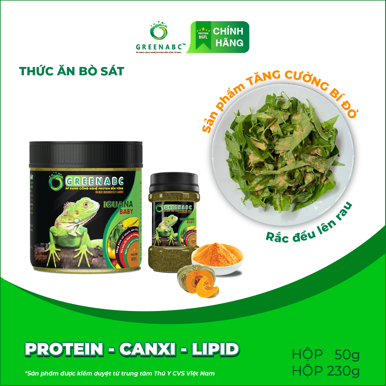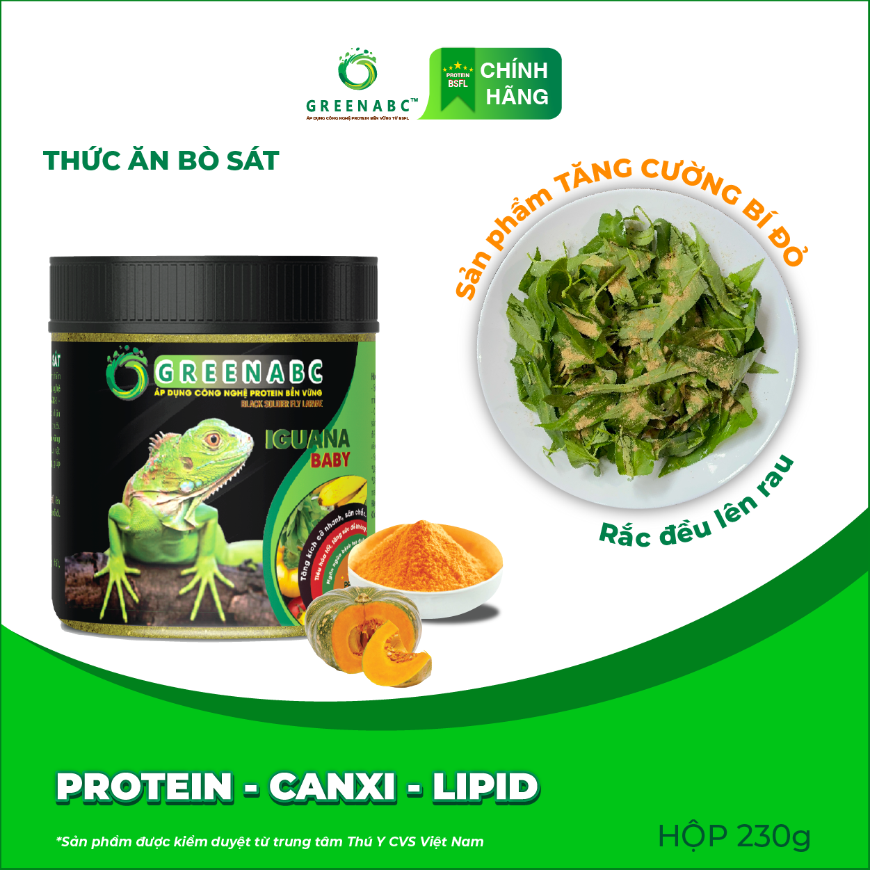 GREENABC là thức ăn cao cấp dành cho Iguana Baby - Rồng Nam Mỹ Baby Đặc biệt sản phẩm GREENABC được sản xuất theo phương pháp Áp dụng công nghệ PROTEIN bền vững từ bột đạm G.Meal rất giàu PROTEIN – CANXI – LIPID có trong BSFL, đã được Mỹ (AAFCO) và EU chấp nhận đưa vào công thức cho ngành sản xuất thức ăn dành cho vật nuôi.