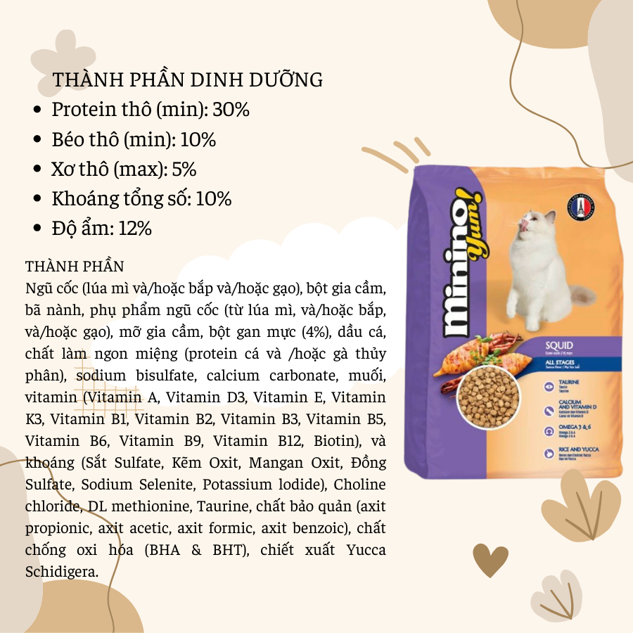 Thức ăn cho mèo Minino gồm các thành phần chính sau: Gạo, sản phẩm từ lúa mì, chất béo gia cầm chứa Omega 3 và 6, bột đậu nành, bột cá, dầu cá chứa DHA, taurine, khoáng chất; vitamin A, K3, B2, B6, B1, D3, B12, E, canxi, các khoáng chất đồng, selen, sắt, mangan, kẽm, iốt; canxi; axit Folic; Biotin; Choline; Natri Disulfate; Palatants; Monocalcium Phosphate; Chiết xuất Yucca Schidigera; Chất chống oxy hóa;