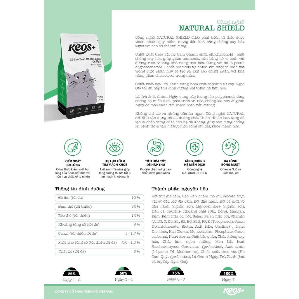 - Kiểm soát búi lông : công thức kiểm soát búi lông của Keos kết hợp với chất xơ tự nhiên