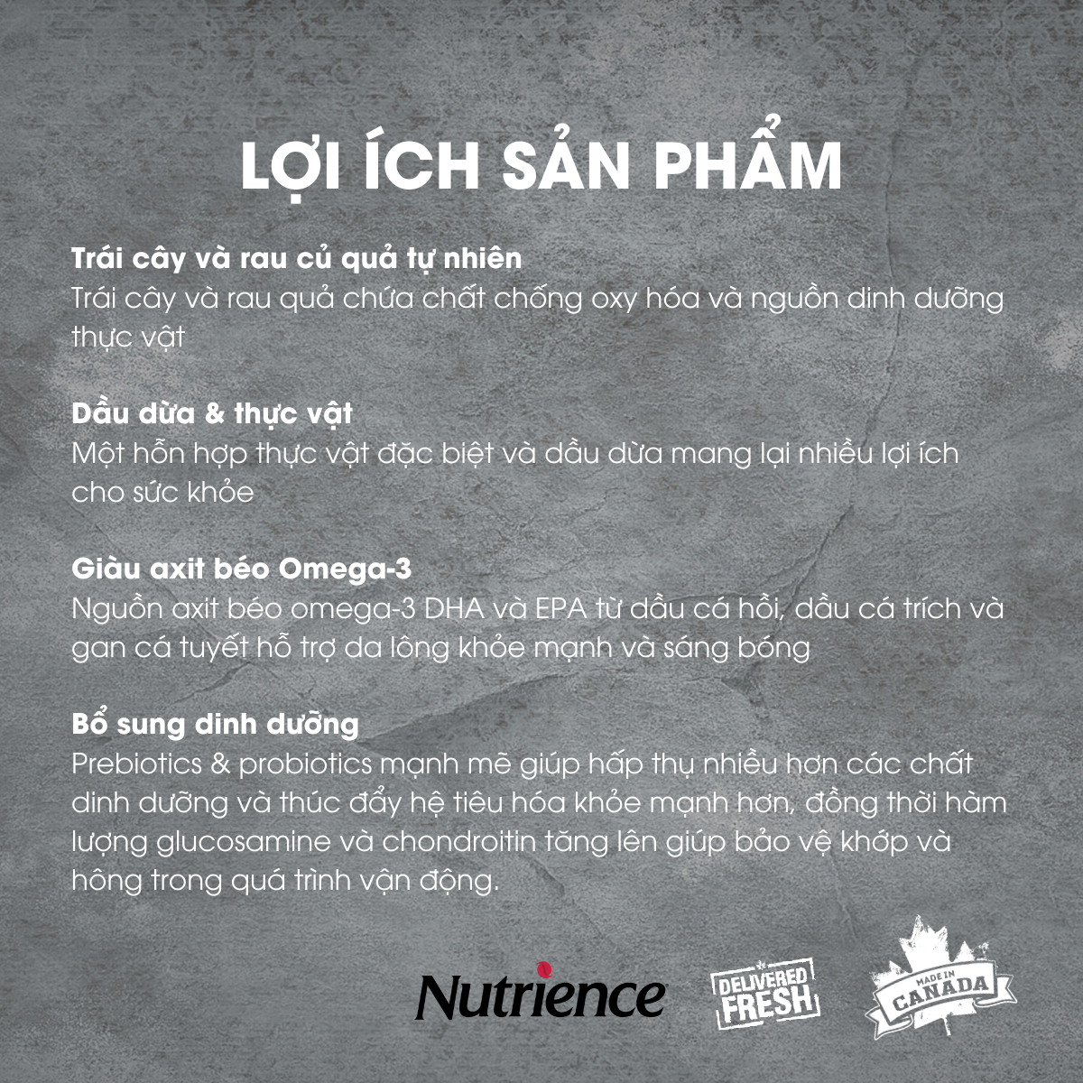 - Thành Phần Nguyên Liệu: Xuất xứ Canada HSD: 12 tháng từ ngày sản xuất trên bao bì