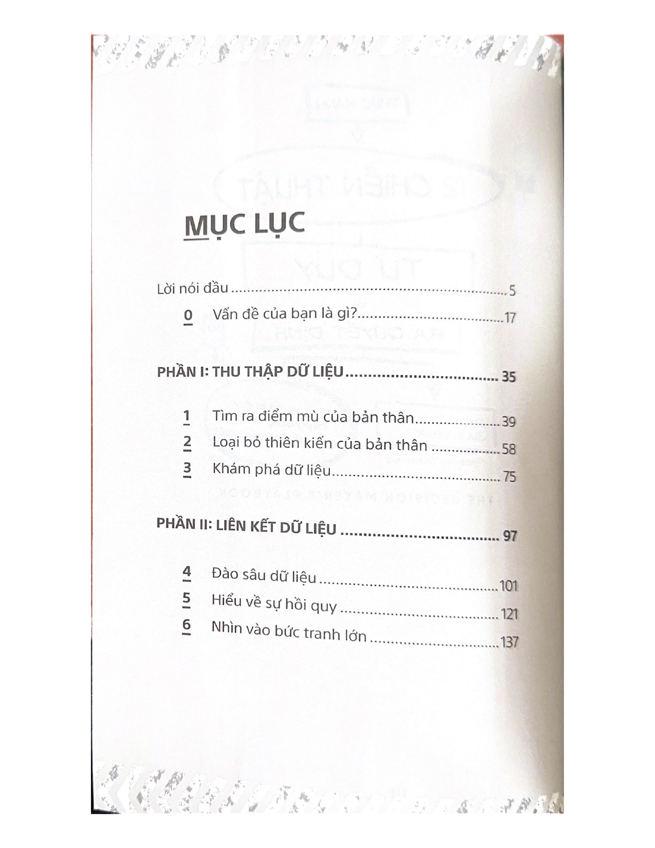 - Giới thiệu Thực Hành 12 Chiến Thuật Tư Duy Ra Quyết Định Cuộc sống chính là kết quả của những quyết định. Mỗi ngày, chúng ta đều phải đưa ra hàng trăm sự lựa chọn khác nhau: từ những lựa chọn đơn giản (như trưa nay ăn gì), cho đến những lựa chọn quan trọng (như làm công việc gì và sống ở đâu). Chúng ta đang sống trong một thế giới ngày càng phức tạp, vậy nên rất cần những mô hình tư duy giúp ta phân tích thực tế một cách hiệu quả và đưa ra những quyết định sáng suốt hơn, nhanh chóng hơn. Cuốn sách mà bạn đang cầm trên tay sẽ mang đến nhiều ví dụ, công cụ và chiến thuật hữu ích để bạn nâng cao chất lượng, tốc độ và hiệu quả đưa ra quyết định. Khi làm chủ được những chiến thuật trong sách, bạn sẽ dễ dàng vượt qua các tình huống tiến thoái lưỡng nan và những vấn đề hóc búa, từ đó thành công hơn trong cả công việc lẫn cuộc sống.