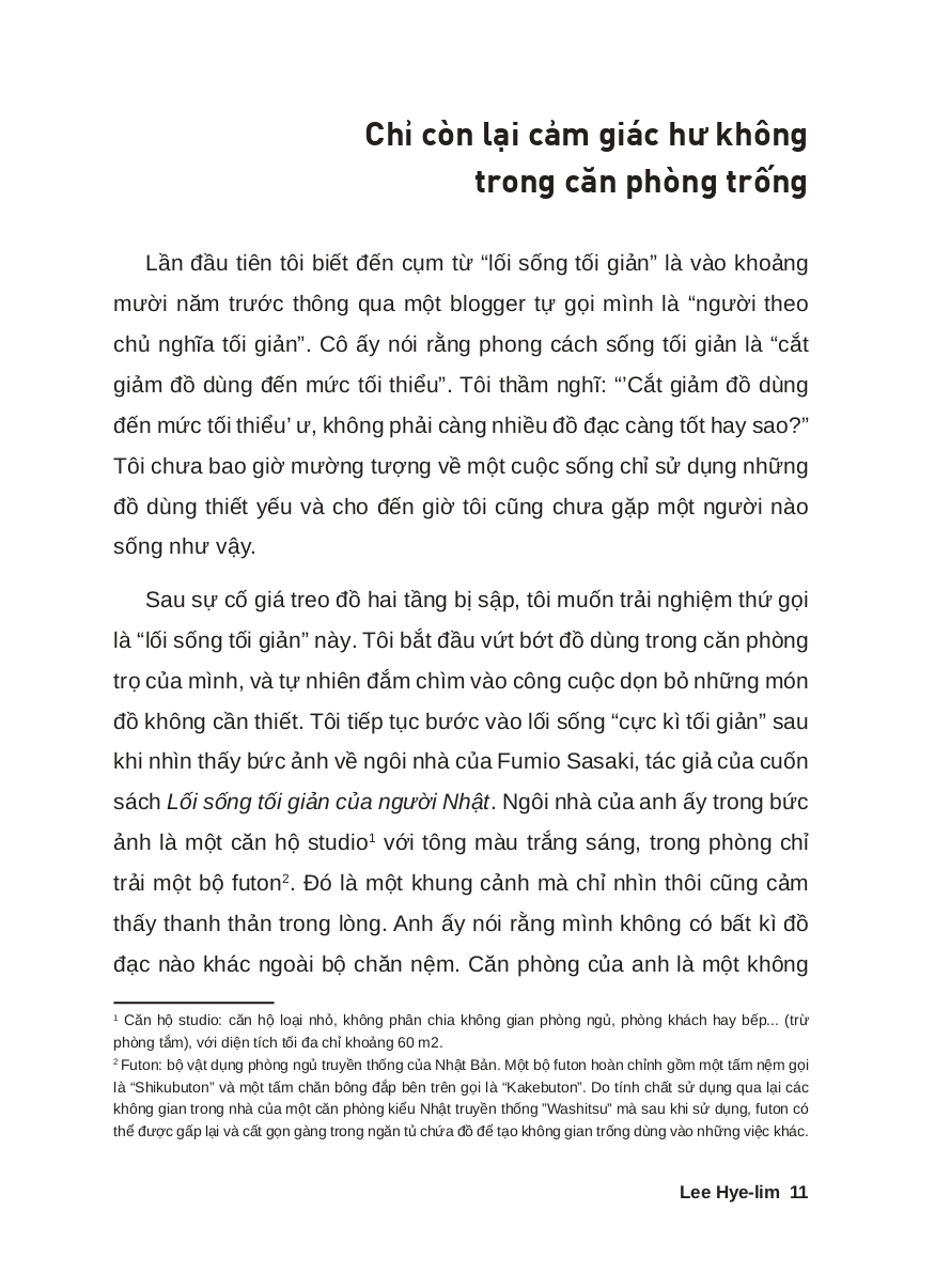 • Thanh lọc các mối quan hệ xã hội, thói quen sinh hoạt, ăn uống, làm việc hàng ngày Đích đến cuối cùng của lối sống tối giản chẳng phải là để sống tốt hơn, sống hạnh phúc hơn hay sao? Mong rằng bạn sẽ không tự làm khổ chính mình chỉ vì muốn tạo ra một không gian trống, một tủ quần áo chỉ treo vài bộ đồ đơn sắc hay một chiếc bồn rửa không đặt bất kì thứ gì lên trên bề mặt. Bởi vì lối sống tối giản không có đáp án cố định. Hãy học cách giải phóng khỏi những ham muốn tầm thường và tận hưởng một cuộc sống hoàn-toàn-tự-do theo cách của riêng bạn! Về tác giả: Lee Hye-lim là tác giả, người thực hành sống tối giản lành mạnh. Cô từng là người theo chủ nghĩa tối đa, mỗi ngày phải diện nhiều quần áo và phụ kiện khác nhau để ra ngoài, từng làm sập giá treo đồ hai tầng vì quá nhiều đồ đạc. Sau hơn 10 năm thực hành sống tối giản giờ đây cô trở thành người tự do, đi du lịch chỉ bằng chiếc va li nhỏ, tủ đồ 4 mùa chỉ 30 bộ quần áo, và hoàn toàn thoải mái trong một thế giới chỉ lấp đầy bằng những thứ cô yêu.