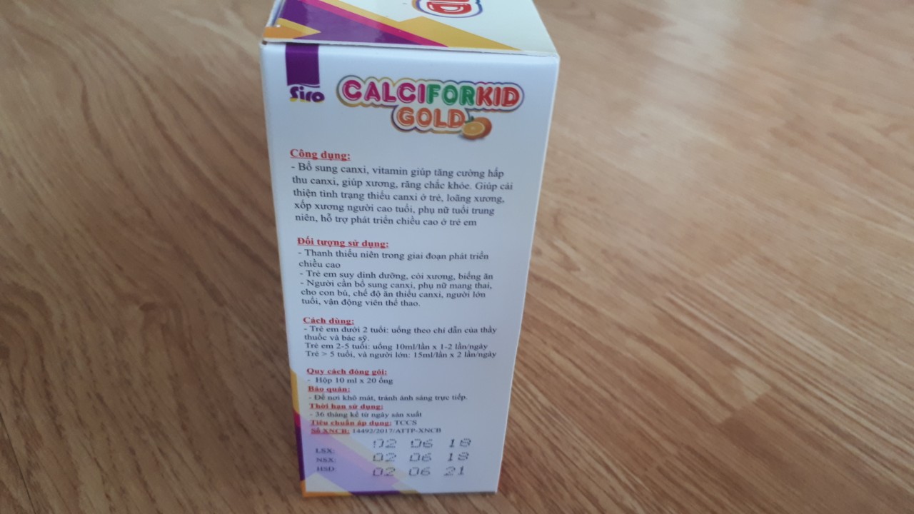 Mua tại TiktokQuy Cách Đóng Gói: 20 Ống x 10 ml Thành Phần: Claci Glucoheptonate 500 mg Thymomodulin 5% 50 mg L-Lysine HCL 50 mg Taurin 20 mg DHA 10% 100 mcg Kẽm Gluconate 5 mg Cao men bia 50 mg Vitamin B1 16 mg Vitamin B12 16 mg Vitamin A 500 IU Vitamin D3 50 IU Phụ liệu vừa đủ 10 ml Công dụng : Bổ sung canxi, vitamin giúp tăng cường hấp thu canxi, giúp xương, răng chắc khỏe. Giúp cải thiện tình trạng thiếu canxi ở trẻ, loãng xương, xốp xương người cao tuổi, phụ nữ tuổi trung niên, hỗ trợ phát triển chiều cao ở trẻ em Đối tượng sử dụng: