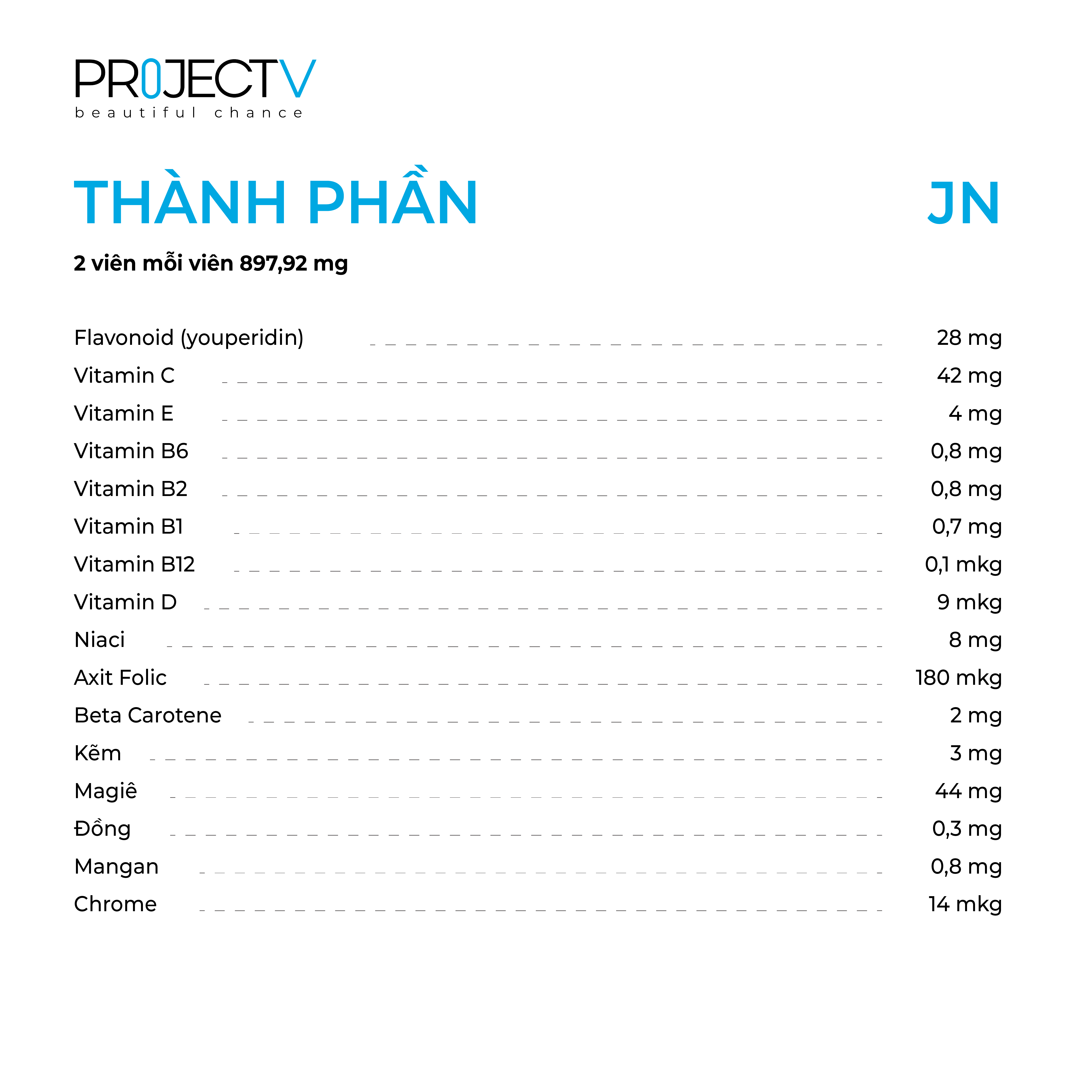 JN cung cấp cho cơ thể trẻ em tất cả các vitamin, các nguyên tố vi lượng và đa lượng cần thiết để phát triển toàn diện. JN thuộc dòng Junior Hit đến từ thương hiệu Project V là sản phẩm đảm bảo sự phát triển hài hòa của tất cả các chức năng của cơ thể trong thời kỳ tăng trưởng tích cực: thể chất, trí tuệ và tinh thần.