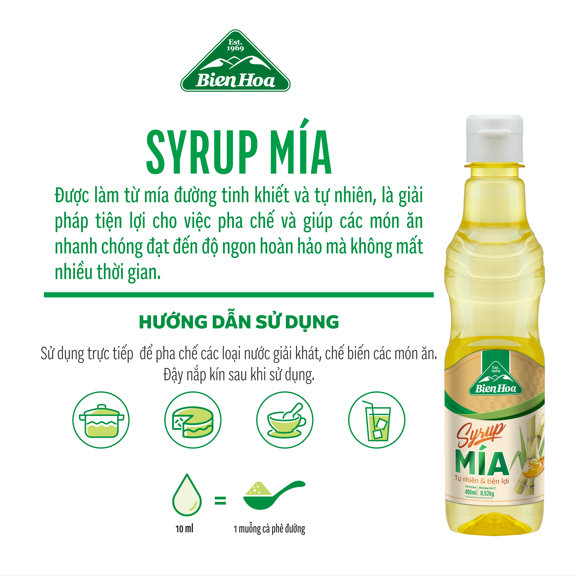 SẢN PHẨM ĐỘC NHẤT, TIÊN PHONG Dễ tan ngay cả trong nước lạnh, giảm tính kết tinh cho các sản phẩm được sản xuất khi dùng. Đường mía lỏng mang vị ngọt đặc trưng của mía đường và có độ ngọt cao hơn so với đường tinh luyện thông thường nhờ có sự hiện diện của đường fructose tự nhiên. HOÀN TOÀN TỰ NHIÊN: Nguyên liệu là đường tinh luyện chất lượng cao; Sản phẩm được sản xuất hoàn toàn bằng phương pháp hữu cơ, không hóa chất phụ gia, TIÊU CHÍ 03 KHÔNG: Không phẩm màu. Không hóa chất phụ gia và chất tạo ngọt nhân tạo Không hình thành HMF ( Hydroxy Methyl Furfurol) là chất độc gây ung thư. SỰ TIỆN LỢI, BẢO QUẢN : Sản phẩm đóng chai tiện lợi, có thể mua dể dàng ở các cửa hàng trên toàn quốc. Dễ dàng lưu trữ, bảo quản mà không làm mất đi vị ngon của sản phẩm và sử dụng bất kể thời điểm bạn muốn. KINH TẾ – TIỆN DỤNG – TIẾT KIỆM Đậm Đà Hơn Tiện Lợi Hơn. Tiết Kiệm Hơn