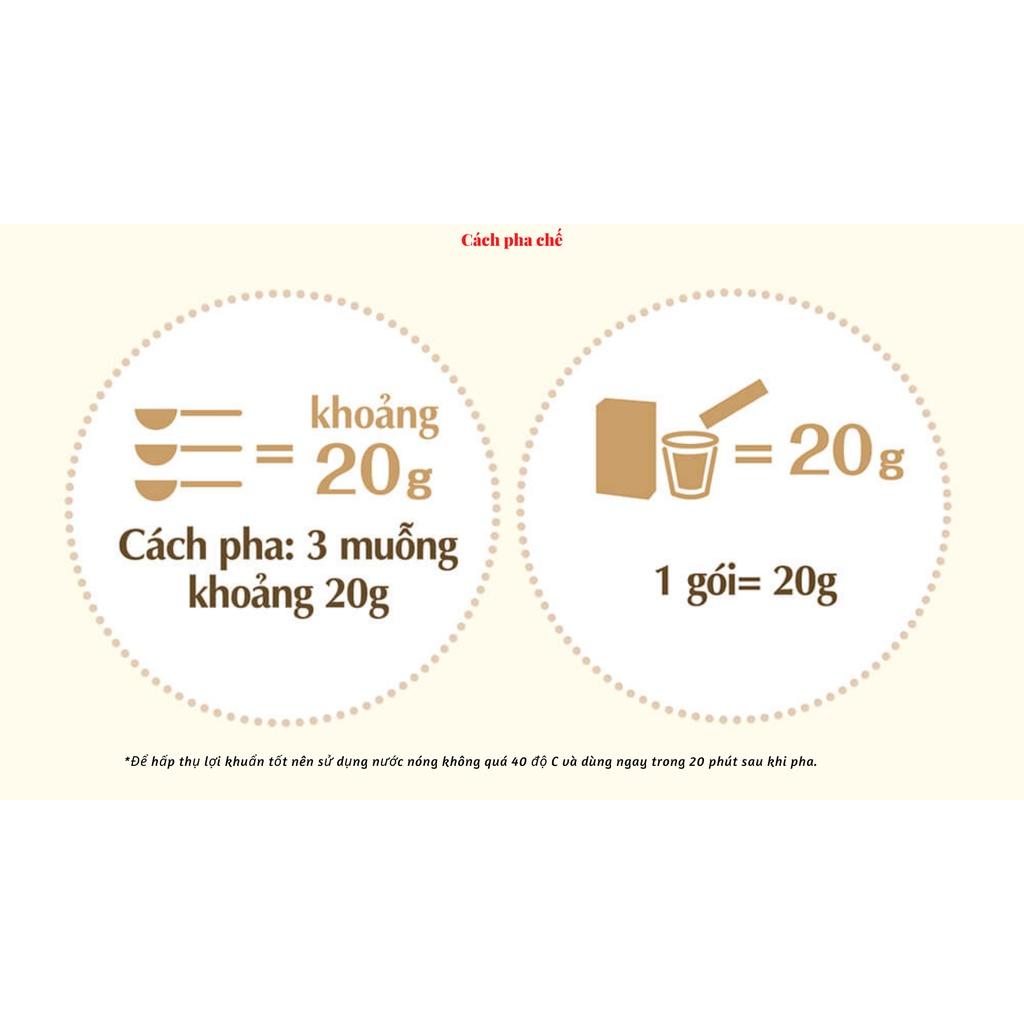 Sữa dạng gói tiện lợi. Trong 1 hộp chứa 10 gói, mỗi gói có hàm lượng 20g. Quý khách có thể bỏ túi, để tại nơi làm việc, mang theo khi đi ra ngoài, du lịch, rất tiện lợi và gọn gàng.