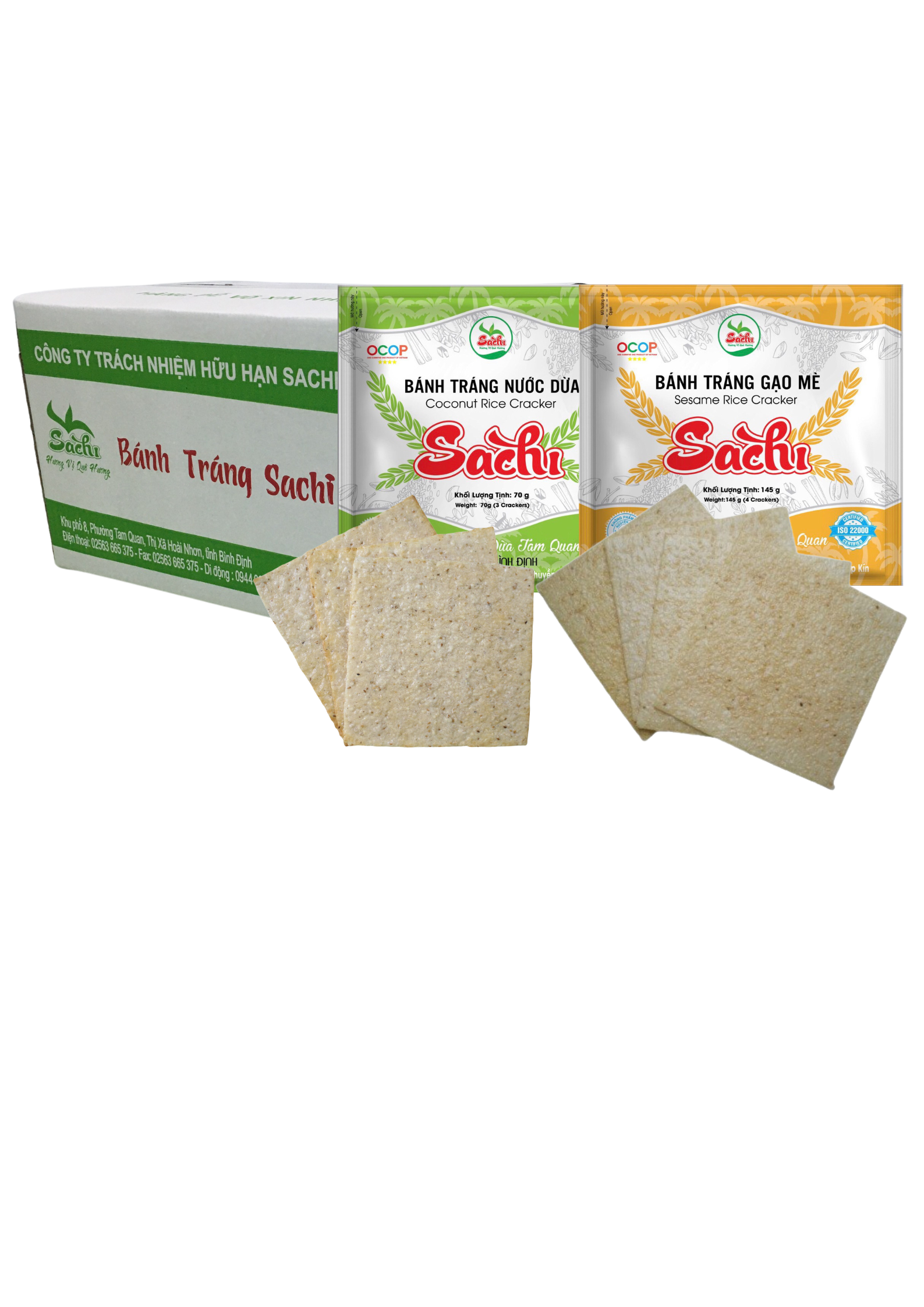 Bánh tráng gạo mè và bánh tráng nước dừa nướng sẵn Sachi xốp, giòn rụm, được sản xuất trên dây chuyền hiện đại khép kín, bánh nướng bằng điện vàng đều 2 mặt, bao bì hút chân không đảm bảo an toàn vệ sinh thực phẩm.