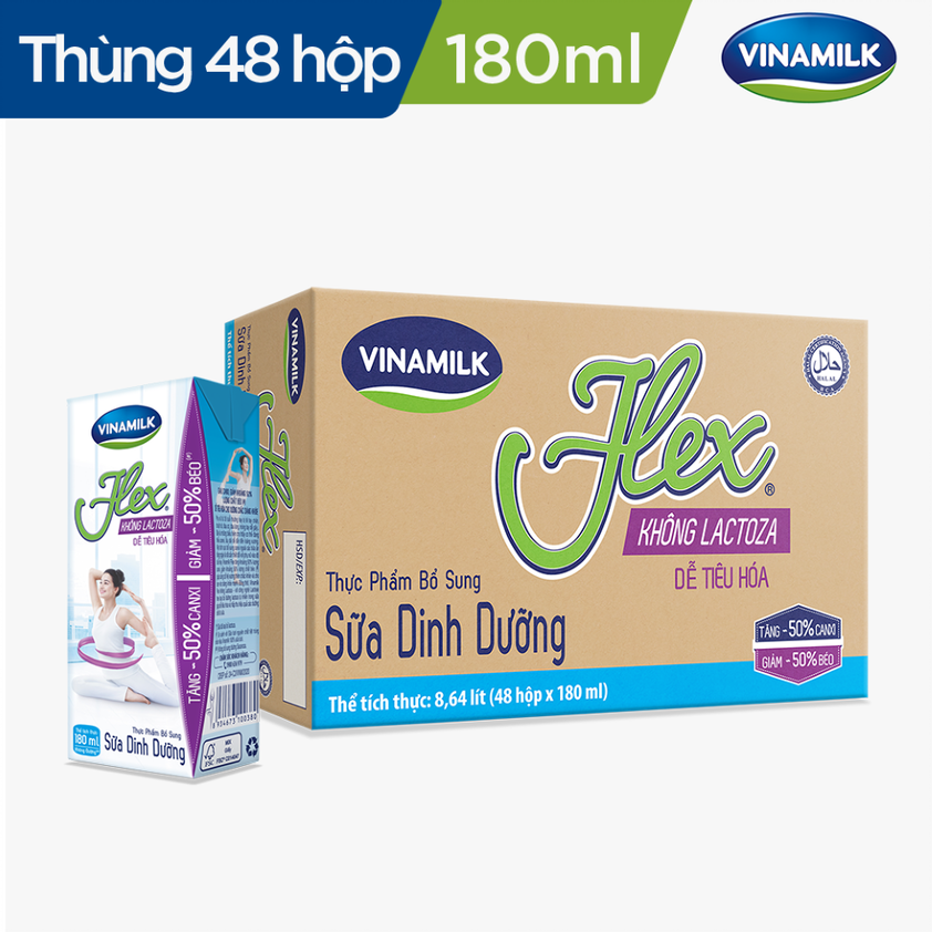 - Thùng 48 Hộp Sữa tiệt trùng Vinamilk Flex không Lactose (180ml) dành cho cả gia đình, đặc biệt phù hợp cho các đối tượng muốn uống sữa để bổ sung Canxi và Vitamin D nhưng lại có hiện tượng sôi bụng và khó tiêu do cơ thể không dung nạp Lactoza.