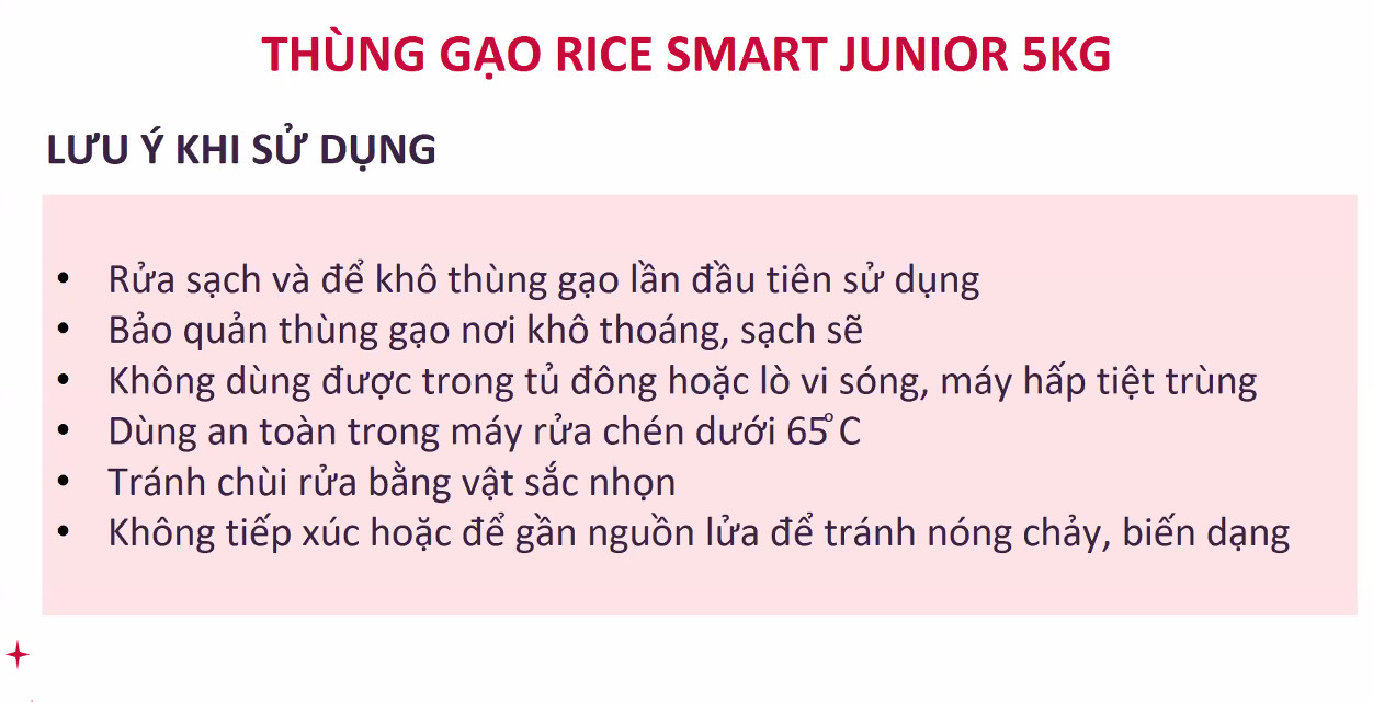 Công dụng: - Với dung tích nhỏ gọn 5kg, sản phẩm thùng gạo Rice Smart Junior phù hợp với việc bảo quản các loại thực phẩm như gạo, nếp, gạo lứt, hạt dinh dưỡng,…