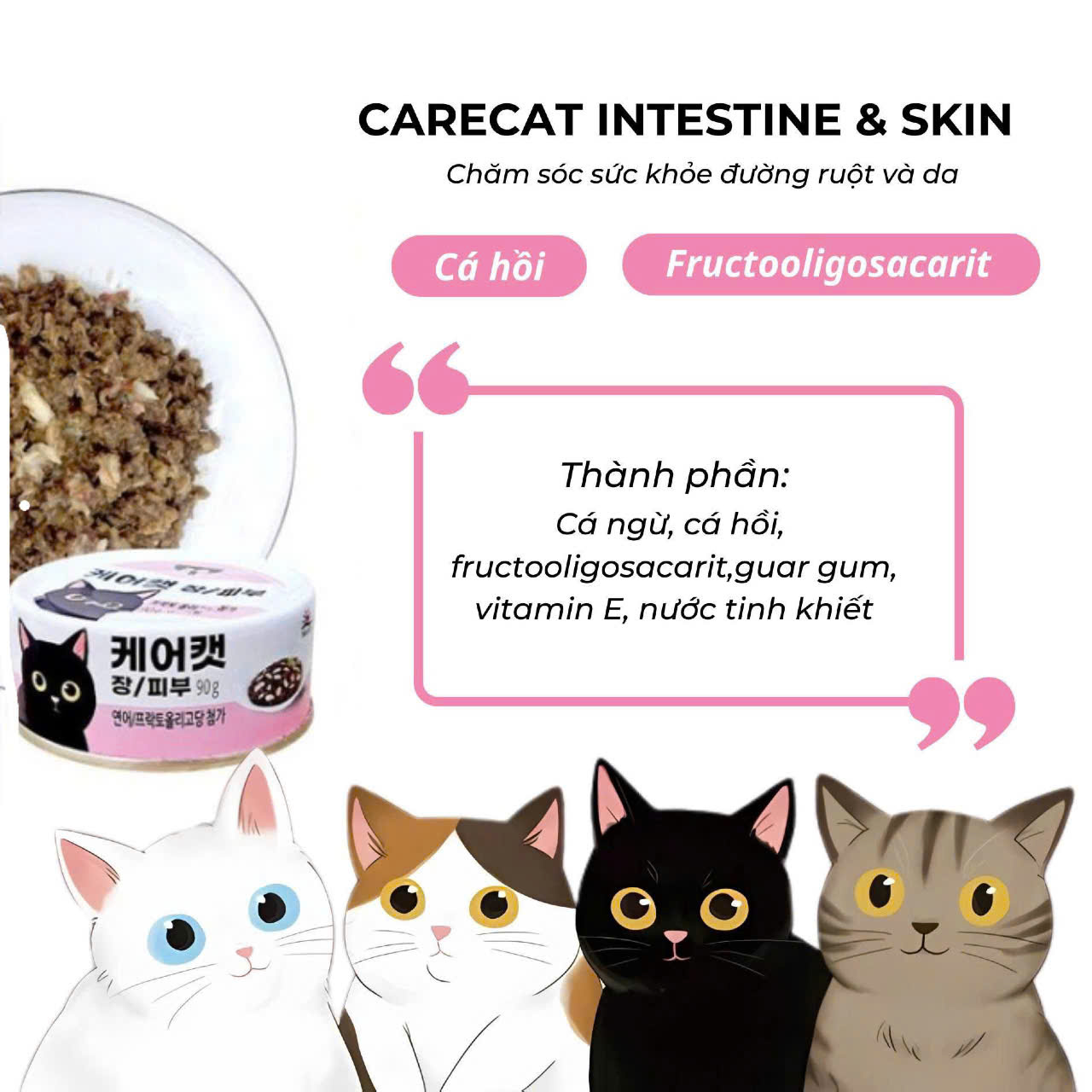 Mô tả sản phẩm Pate cho mèo CareCat (nhập khẩu từ Hàn Quốc) với 4 chức năng hỗ trợ: Care Cat Eye Care: Chăm sóc đôi mắt sáng khỏe Care Cat Anti Inflammatory: Chống viêm da Care Cat Intestine & Skin: Chăm sóc đường ruột và da Care Cat Hair Ball: Hỗ trợ kiểm soát búi lông Thành phần: Cá ngừ, cá thu, cá hồi, ức gà, taurine, guar gum, vitamin E, nước tinh khiết. Độ dinh dưỡng: Đạm thô (tối thiểu): 10% Béo thô (tối thiểu): 0.7% Xơ thô (tối đa): 0.9% Khoáng (tối đa): 4% Độ ẩm (tối đa): 85.5%