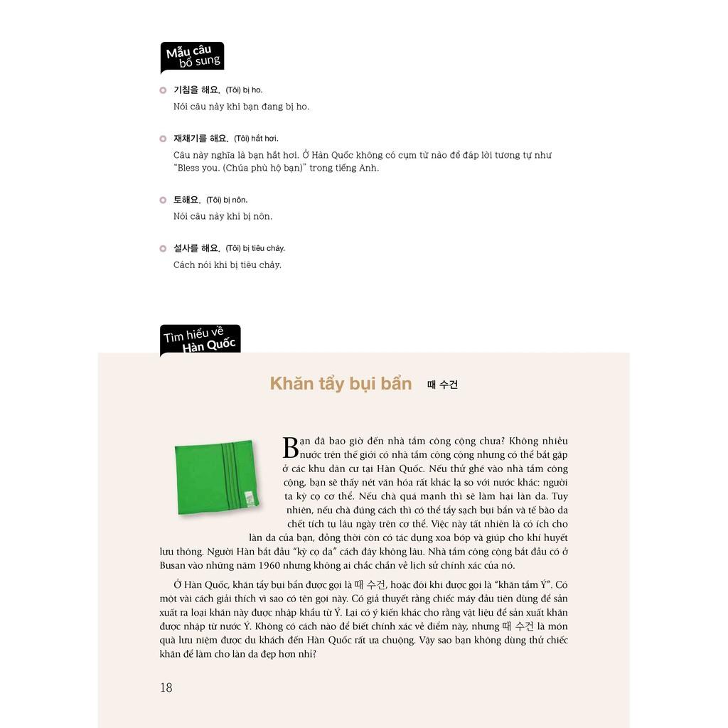 Ở cuối mỗi chủ đề là những câu chuyện thú vị về văn hóa, đời sống và lịch sử Hàn Quốc mà trong đó, ngôn ngữ được lồng ghép khéo léo. Bạn sẽ biết thêm về củ cải muối, thịt ba chỉ muối, phong cách nhuộm màu tự nhiên và rất nhiều nét đặc trưng khác của xứ sở kim chi. Những câu chuyện này sẽ giúp bạn cảm nhận vẻ đẹp của Hàn Quốc, hiểu được văn hóa thẩm thấu trong ngôn ngữ như thế nào, từ đó thêm yêu tiếng Hàn và có động lực học ngôn ngữ này hơn.