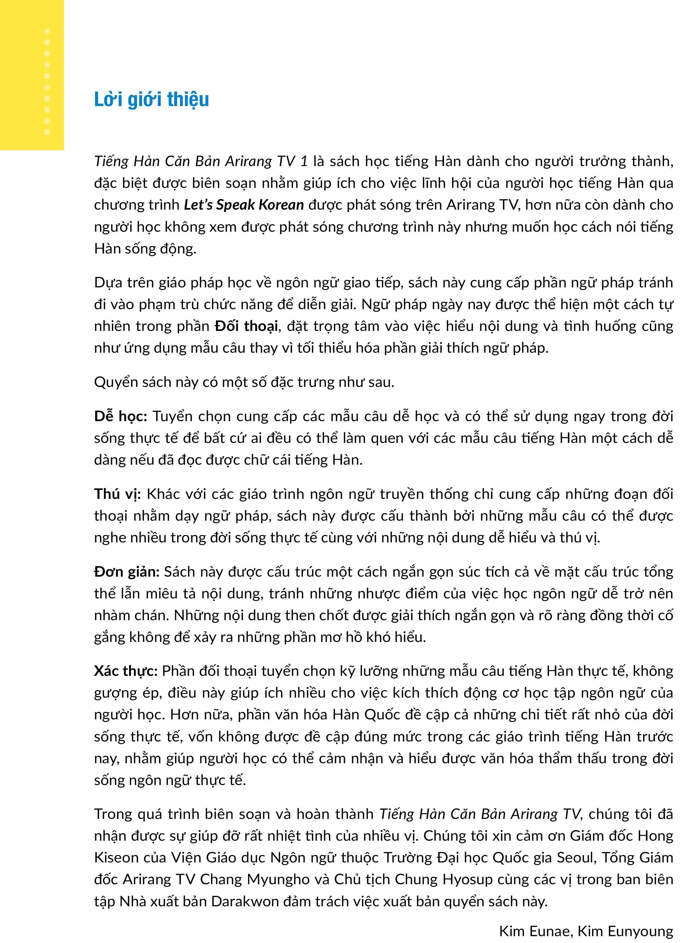 Bộ sách Tiếng Hàn Căn bản Arirang TV (Arirang Korean Basics) gồm hai cuốn, trải dài 130 bài học mẫu câu phổ biến nhất trong tiếng Hàn hằng ngày, mang đến cho bạn một trải nghiệm học tiếng Hàn thực tế, rất gần gũi với cách giao tiếp thường ngày của người Hàn.