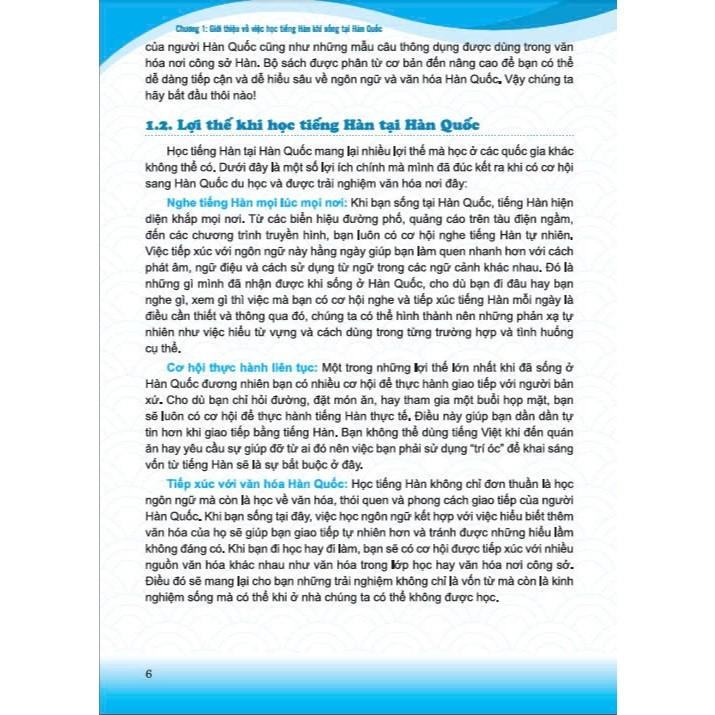 Sách được xây dựng từ cơ bản dành cho những người chưa từng học qua tiếng Hàn đều có thể học được. Cuốn sách được chia thành 2 phần tối ưu cho người tự học: Phần 1 - Hướng dẫn phát âm tiếng Hàn Nguyên âm, phụ âm, phụ âm cuối, quy tắc viết chữ, quy tắc phát âm. Đây là những bài học cơ bản nhất và được trình bày rất rõ ràng, dễ hiểu. Phần 2 - Luyện nghe nói Hướng dẫn từng mẫu câu và từ vựng cơ bản cho các chủ đề gần gũi trong cuộc sống như chào hỏi, phương hướng, giá cả, thời gian, ngày tháng, thời tiết, nhà hàng, mua sắm... Phiên âm Với phần phiên âm, sách đưa ra cả âm chuẩn lẫn âm bồi tiếng Việt để người tự học dễ dàng tiếp thu và thực hành theo. Cuốn sách không áp đặt cách học vẹt khi luôn đưa ra đầy đủ lý do cho ngữ pháp hay cách phát âm, ví dụ như cùng một âm tiết nhưng cách phát âm sẽ khác nhau do có phụ âm cuối khác nhau. Cuốn sách còn có sự hỗ trợ đắc lực từ đĩa CD do các giáo viên Hàn Quốc thể hiện, giúp bạn học cách phiên âm, giọng điệu đúng chuẩn.