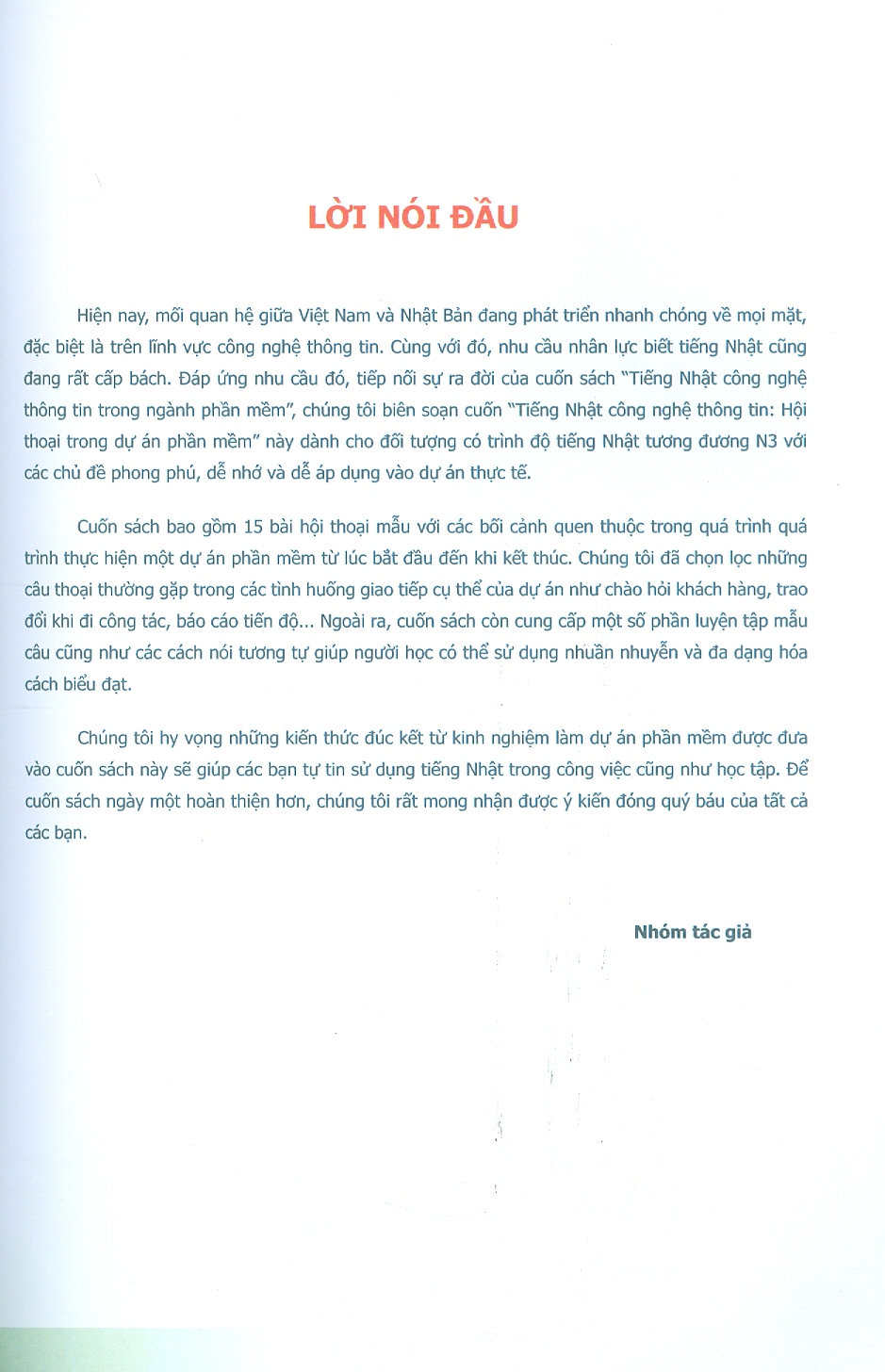 Nhóm tác giả hy vọng những kiến thức đúc kết từ kinh nghiệm làm dự án phần mềm được đưa vào cuốn sách này sẽ giúp các bạn tự tin sử dụng tiếng Nhật trong công việc cũng như học tập. Để cuốn sách ngày một hoàn thiện hơn, chúng tôi rất mong nhận được ý kiến đóng quý báu của tất cả các bạn.