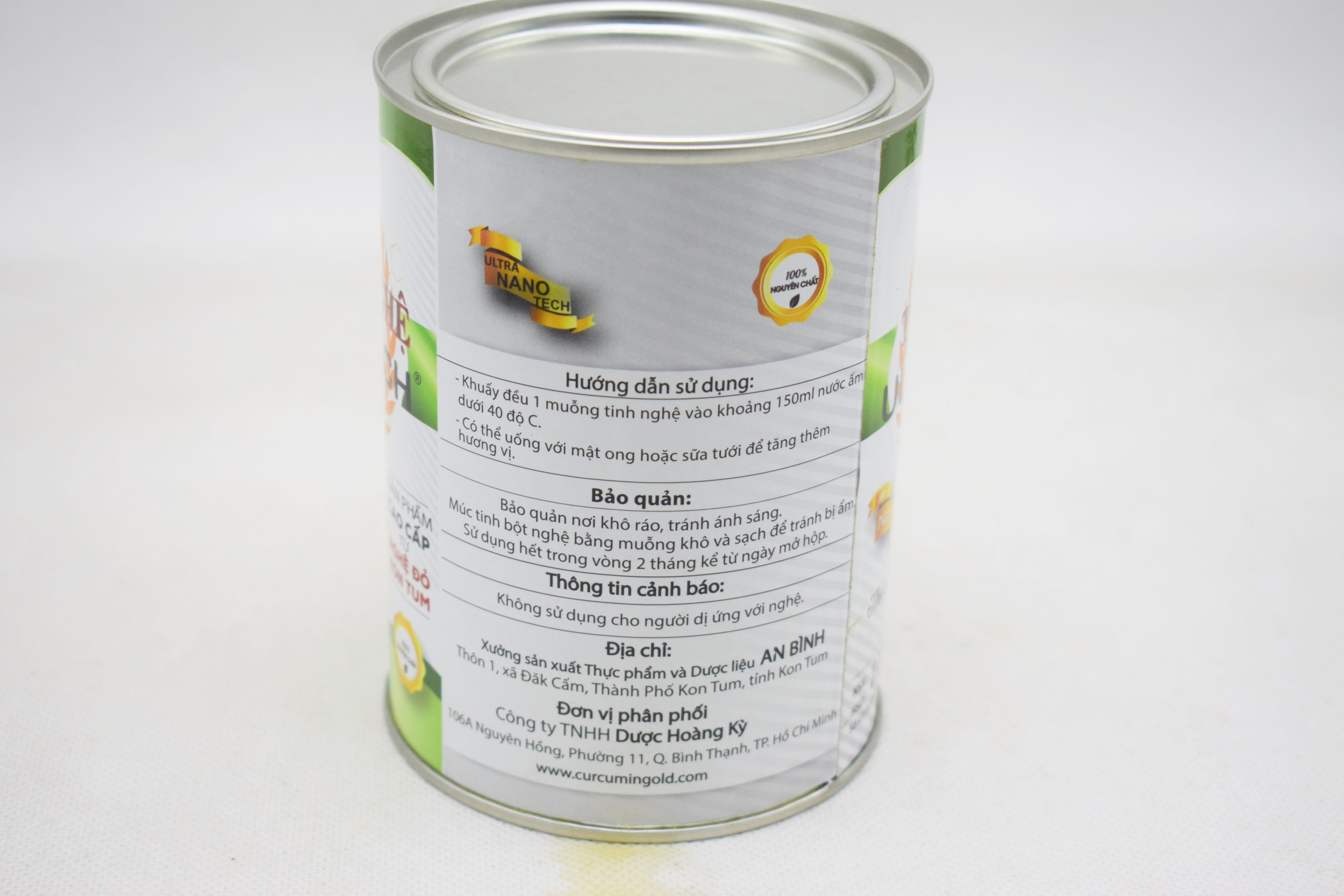 - Nano Curcummin: 40.000mg/kg Hàm lượng Curcumin: 40.000mg/kg (gấp 4 lần tinh bột nghệ đỏ thông thường). Màu sắc: Vàng cam. Xuất xứ: Kontum - Việt Nam Hạn sử dụng: 1 năm kể từ ngày sản xuất. Quy cách đóng gói: Lon thiếc 250gr. Điểm Nổi Bật của tinh nghệ Ulnatech: Nano Curcumin và Curcumin tinh khiết, giúp tăng khả năng hấp thu, giảm đào thải Curcumin tối đa trong máu, tăng sinh khả dụng lên đến 2000%. An Bình sử dụng công nghệ hiện đại lò phản ứng nổ chân không tốc độ cao, lên đến 20.000 vụ nổ trên 1 giây. Kết quả tạo ra những hạt curcumin đồng nhất kích thước khoảng khoảng 20nm mà không sử dụng hóa chất. Công dụng chính của tinh nghệ Ulnatech: Đẹp da: Khi bạn dần bước sang tuổi 25, các rối loạn enzyme tyrosinase bắt đầu xuất hiện, chúng trở nên nhạy cảm trước các tác nhân như tia UV, ô nhiễm, thức khuya, Các tác nhân này sẽ làm hoạt hóa enzyme tyrosinase sản sinh ra nhiều melanin làm cho da bạn đổi màu bị sạm, nám, không còn đẹp nữa. Tinh nghệ Ulnatech có tác dụng làm trắng hồng da, xóa vết thâm, nám, sạm nhờ cơ chế ức chế sản sinh melanin trong cơ thể từ sâu bên trong. Giảm đau dạ dày, viêm loét tá tràng: Nguyên nhân chính gây đau dạ dày là do mất cân bằng giữa yếu tố tấn công (acid, pepsin, H.pylori) và yếu tố bảo vệ bảo vệ niêm mạc dạ dày (sự nguyên vẹn của biểu mô phủ, sự tiết nhầy, lớp chất nhầy,). Tinh nghệ Ulnatech chứa hàm lượng curcumin cao có khả năng giảm tổn thương dạ dày do nhiễm trùng và có khả năng ức chế 65 chủng vi khuẩn HP gây viêm loét dạ dày. Giảm thiểu nguy cơ tim mạch và mỡ máu: Nồng độ cholesterol tăng cao là yếu tố chính tạo ra nguy cơ gây xơ vữa động mạch và các vấn đề về mạch vành tim. Nồng độ này tùy thuộc vào quá trình tổng hợp, hấp thu cholesterol ở ruột ra khỏi máu. Curcumin trong tinh nghệ Ulnatech có thể giảm lượng cholesterol huyết tương bằng cách ức chế sự hấp thu cholesterol vào máu. Ngoài ra, curcumin còn có vai trò chống lại sự hình thành cục máu đông, giúp giảm nguy cơ tai biến. Viêm khớp: Chất curcumin trong tinh nghệ Ulnatech sẽ giảm viêm khớp bằng cơ chế ức chế sự giải phóng cytokine gây viêm mà không ra tác dụng phụ như các loại khác cùng công dụng. Nhanh lành vết thương: Giúp mau lành vết thương do tác động phân bổ điều hòa collagen => Đặc biệt phù hợp sử dụng cho người sau mổ và phụ nữ sau sinh. Cải thiện trí nhớ: Curcumin trong tinh nghệ Ulnatech giúp ngăn chặn sự suy giảm trí nhớ nhờ cơ chế chống mảng bám và chống nhiễm độc tế bào thần kinh. Ngăn ngừa Alzhemer ở người lớn tuổi. Giảm trầm cảm, lo lắng. Chống lão hóa, ngăn ngừa ung thư: Nhờ cơ chế giảm viêm và chống oxy hóa nên làm giảm rối loạn trầm cảm và chứng lo lắng. Rất có ích cho người bệnh ung thư vì kích thích cơ chế tự chết của tế bào ung thư. Cách dùng: Tinh nghệ Ulnatech chỉ dùng để uống KHÔNG dùng đắp mặt. Pha với nước ấm, sữa ấm (dưới 40oC), có thể thêm mật ong để tăng hương vị và hỗ trợ tốt hơn.