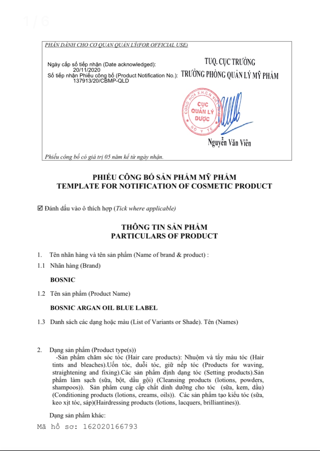 Tinh Dầu Siêu Mượt - Argan Oil Blue Label 120m là dòng sản phẩm dưỡng có thành phần hoàn toàn tự nhiên, chiết xuất từ dầu của quả Argan trong thiên nhiên. Trong thành phần của quả Argan chứa gấp đôi Vitamin E so với dầu từ quả Olive, tăng khả năng làm ẩm cho tóc gấp 4 lần. Đối với những bạn có đặc thù là tóc rễ tre, tóc bị hư tổn bởi các tác nhân bên ngoài như hóa chất, máy làm tóc nhiệt độ cao, nắng, gió,v..v.. luôn lo ngại vì mái tóc lúc nào cũng xơ rối, khô cằn và chẻ ngọn. Vậy thì hãy để Tinh Dầu Siêu Mượt Argan Oil hỗ trợ cho mái tóc bạn trở nên mềm mại, suôn mượt, giảm chẻ ngọn và gãy rụng hơn nhé! Với mùi thơm nhẹ và lớp tinh dầu cô đặc sẽ giúp cho mái tóc bạn hoàn toàn được bao bọc, bất kể là thời tiết hoặc tác động nhiệt. Đây được xem là sản phẩm dưỡng tóc nằm trong Top 1 các sản phẩm dưỡng tóc bán chạy của Bosnic. Hãy thử và cảm nhận vẻ đẹp của mái tóc bạn nhé!